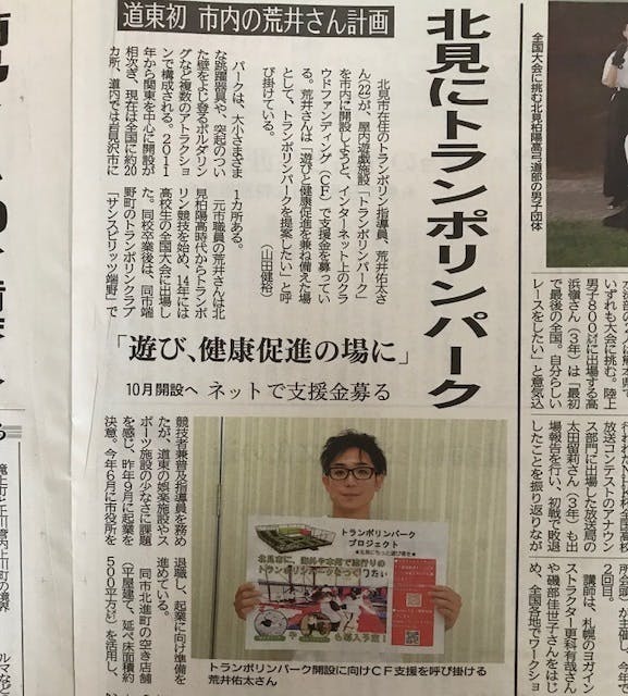 北海道新聞 北見版にトランポリンパークプロジェクトを取り上げていただきました!!