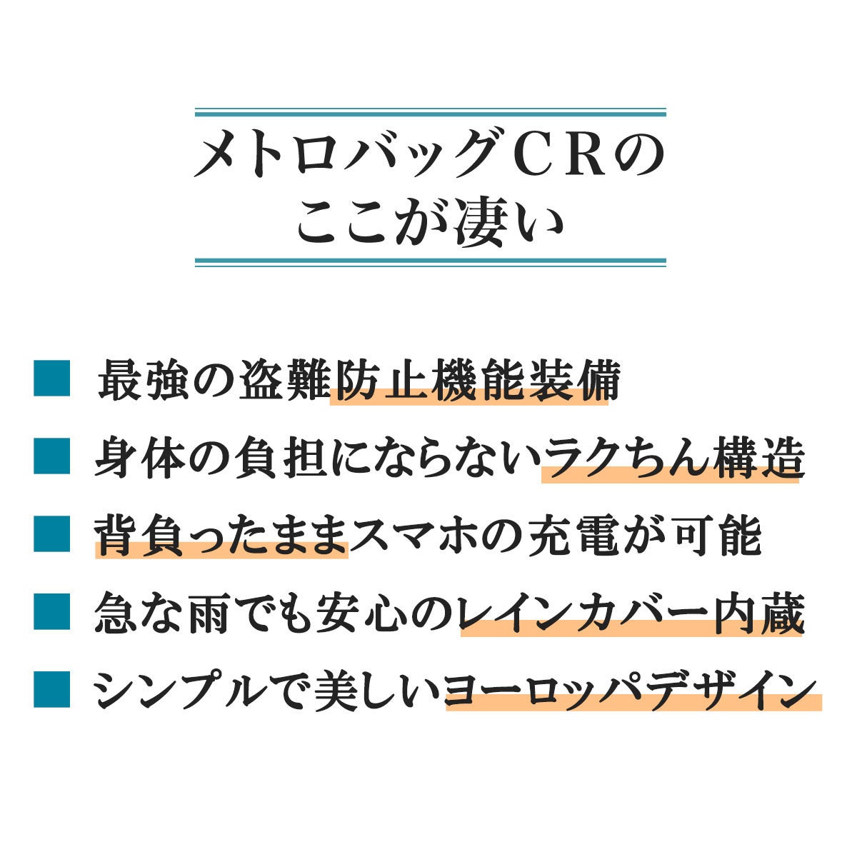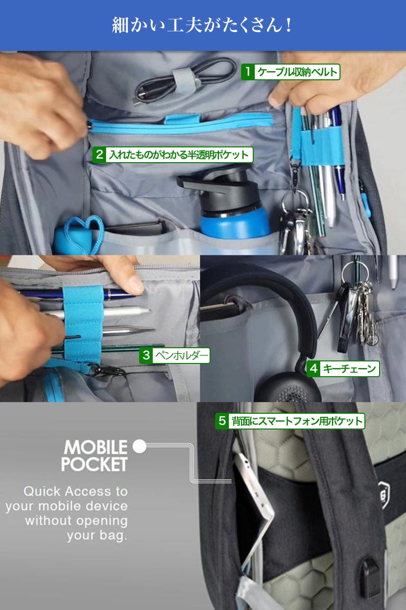 ①カッターでも切れない高度な防刃性、隠しジッパー、スキミング防止ポケットなど最強の盗難防止機能