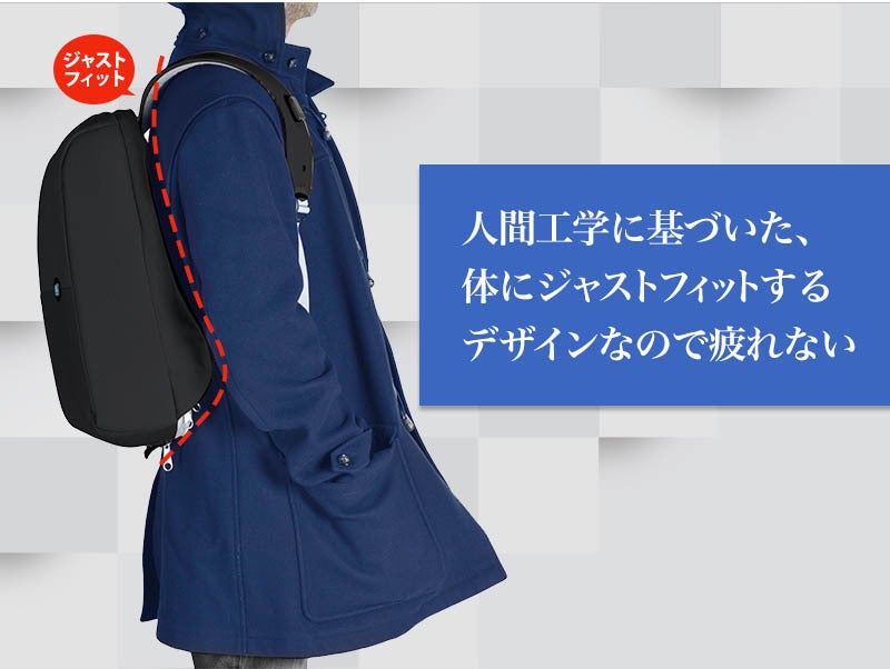 人間工学に基づいたデザイン(Ergonomic Shape)なので、身体にジャストフィットするリュックです。