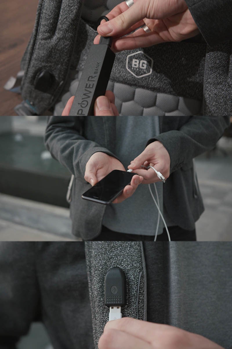 背面ポケットのUSBコードにモバイルバッテリーを繫いでおけば、好きな時にストラップのUSBポートから簡単にスマートフォンの充電ができます。