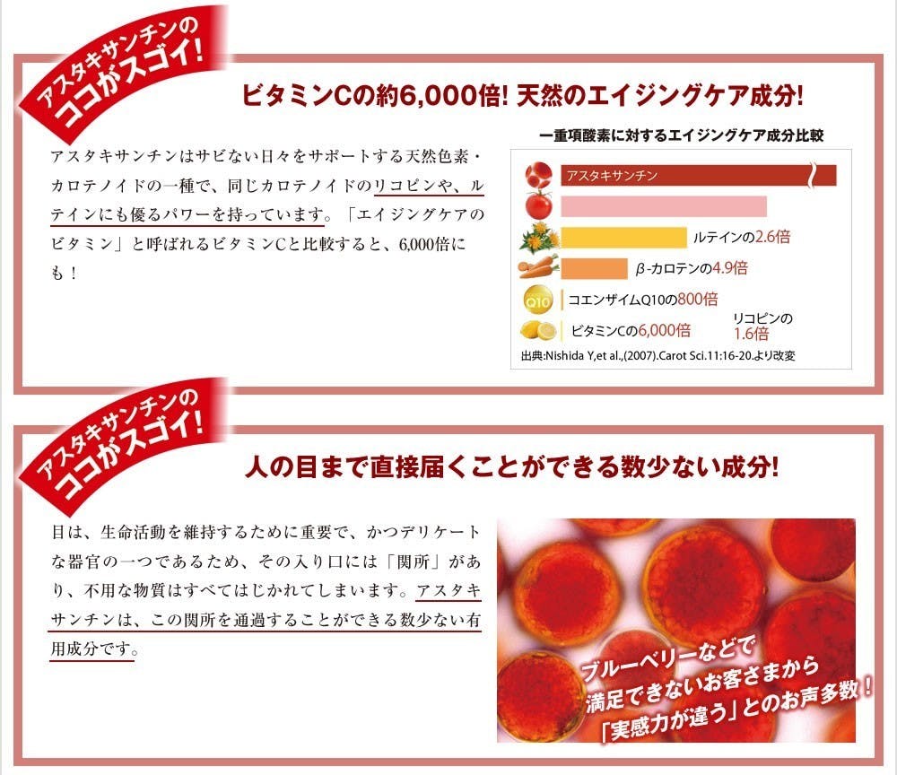 まず、「アスタキサンチン」ですが、優れた抗酸化作用があり=人間の老化の原因とも言われる活性酸素を削減してくれる効果があると言われております。