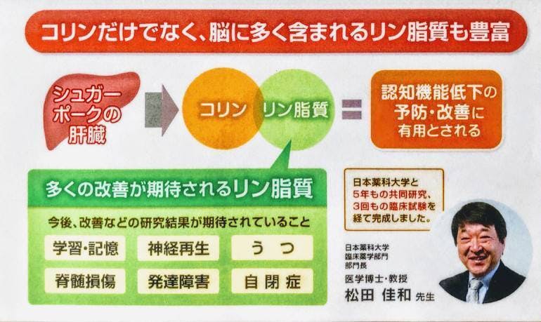 約60兆個の細胞の一つひとつにはリン脂質が含まれているのですが、このリン脂質の重要な成分が先ほどの「コリン」というもので、記憶や学習に深く関わる神経伝達物質で、超高齢化社会にともない、アルツハイマー病や認知症予防にも効果があると言われており、注目を集めている栄養素 でもあります。