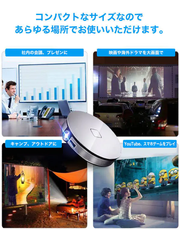 300インチ、3500ルーメンというスペックになるとプロジェクター本体は大きなものばかり。D8Sプロジェクターはハイスペックでありながら、持ち運びに便利な軽量コンパクトサイズ。スピーカーも内蔵のオールインワン。バッグに入れて簡単に持ち運びできます。