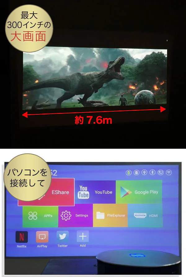 白い壁に投影して、映画やゲームを迫力の大画面で。またパソコン、スマホ、タブレットを接続して動画を超高画質で楽しむことができます。