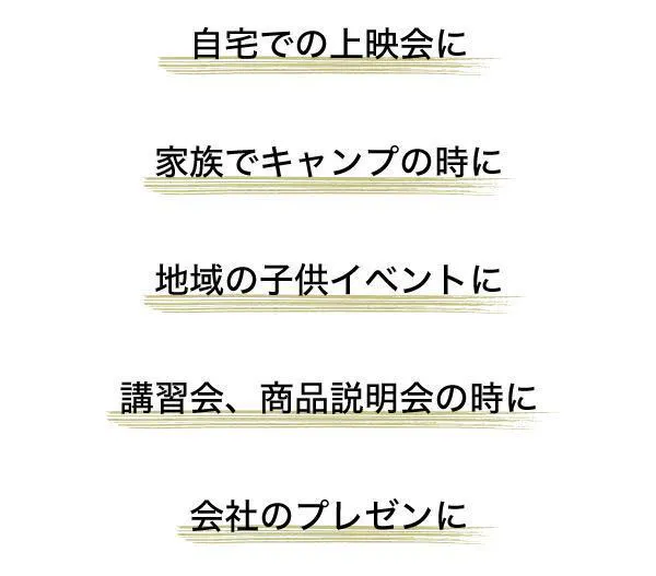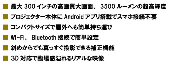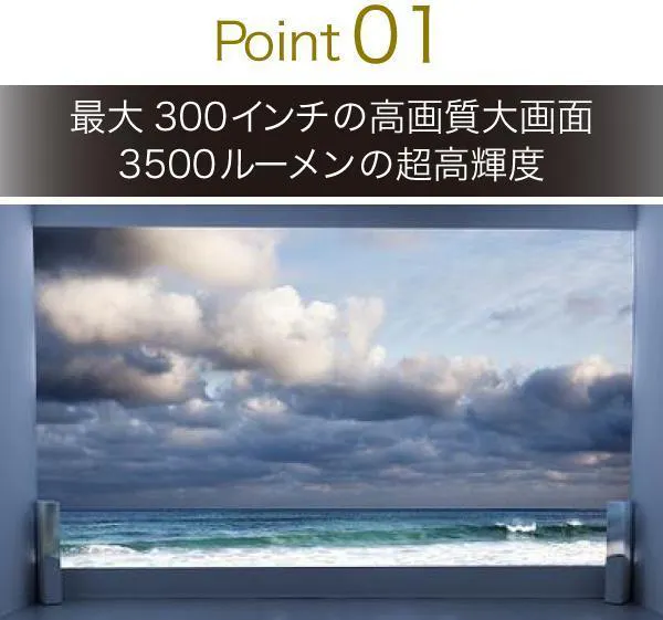 ① 驚異の明るさ3500ルーメン。最大300インチの迫力の大画面!