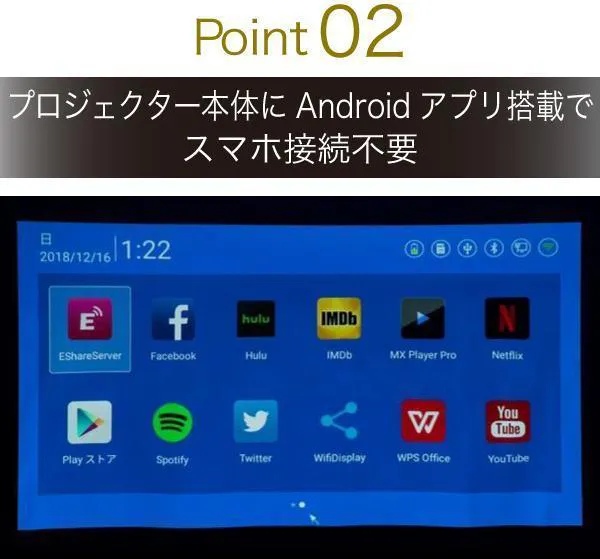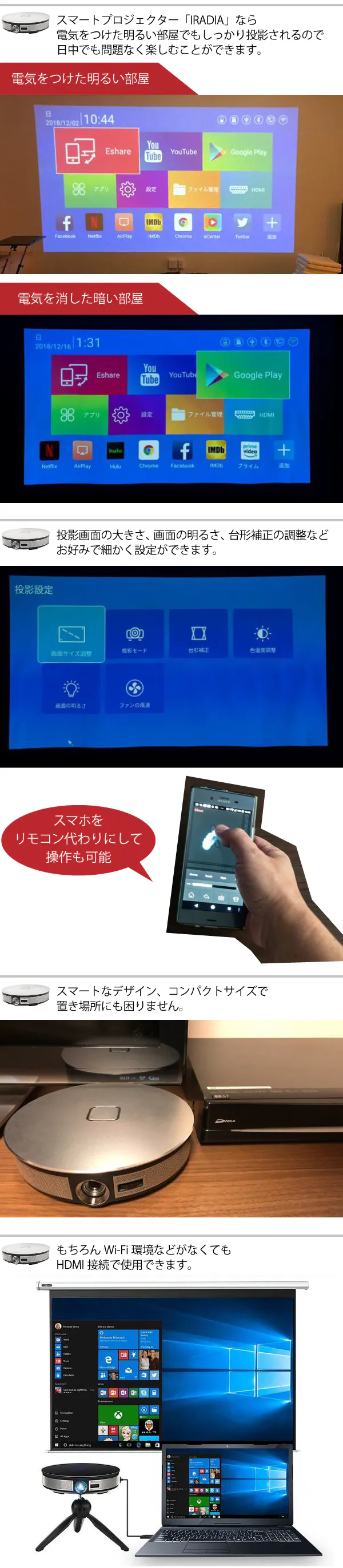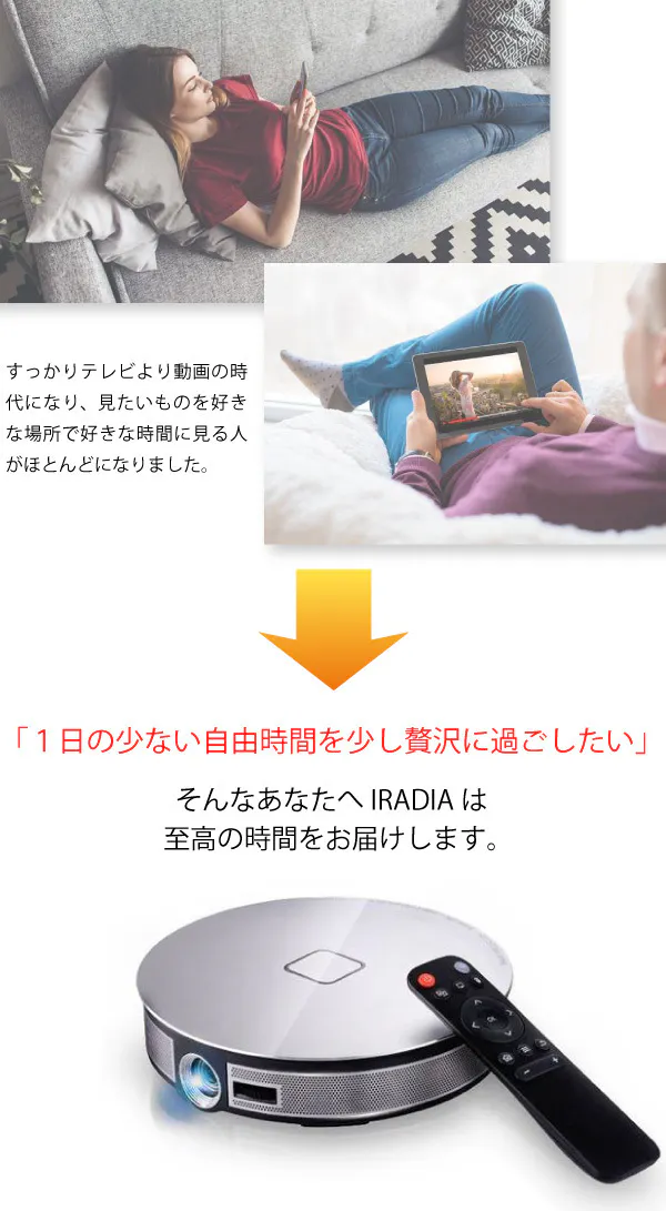 大型プロジェクターの性能を小型プロジェクターに落とし込んだIRADIA。そしてスマホの接続すら必要なく、IRADIA単体でアプリが利用できて映像が楽しめる。