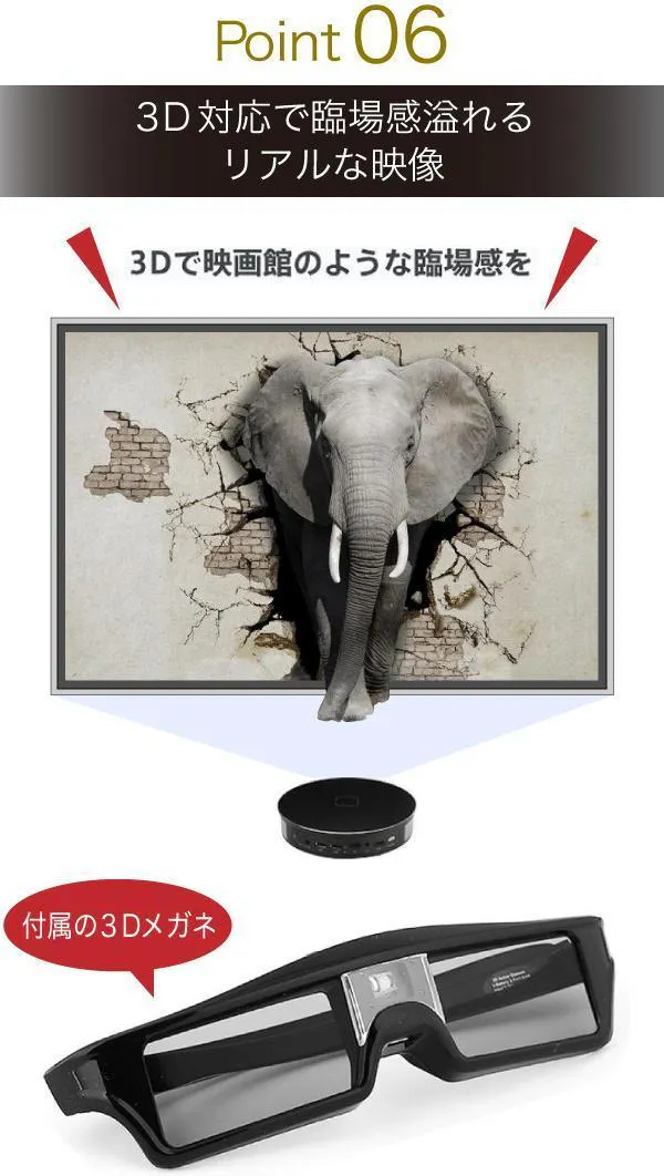 付属の3Dメガネをかけて3D映像を楽しむことができます。映画館で味わう臨場感をあなたの自宅でも。