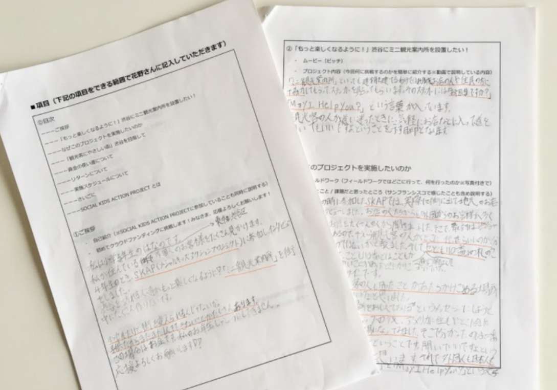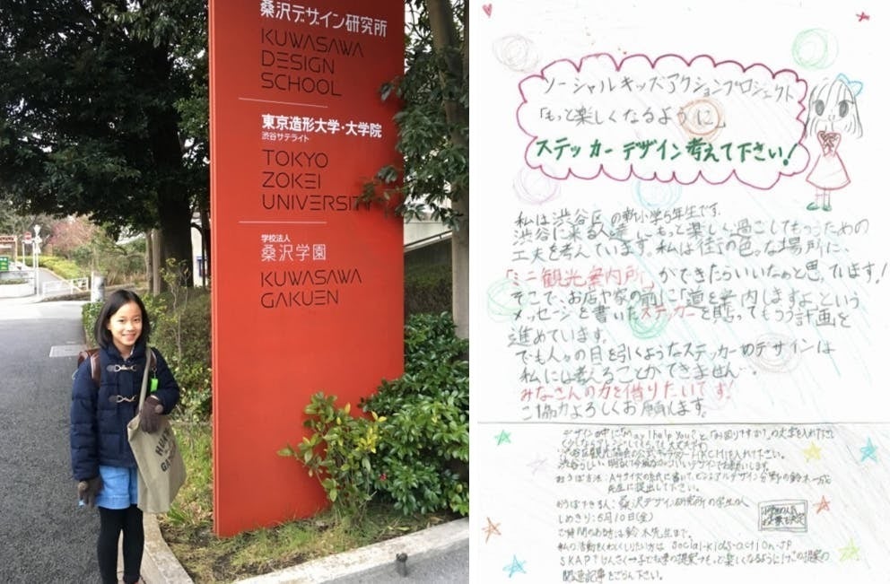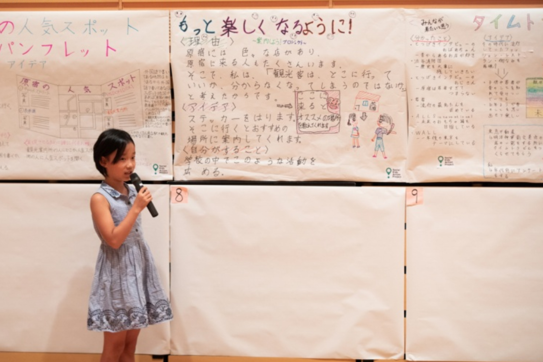 SKAPの5日間のワークショップに参加しました。原宿の街に住んでいる人や訪れる人たちにインタビューをして、他の小学生たちと一緒にどうしたらもっといい街になるか、アイデアを出し合い、自分の考えをまとめました。私はこのとき、観光客の人たちが”もっと楽しくなるように”おススメの場所を教えてくれる案内ステッカーを作りたい、と、区長やたくさんの大人に向けて発表しました。