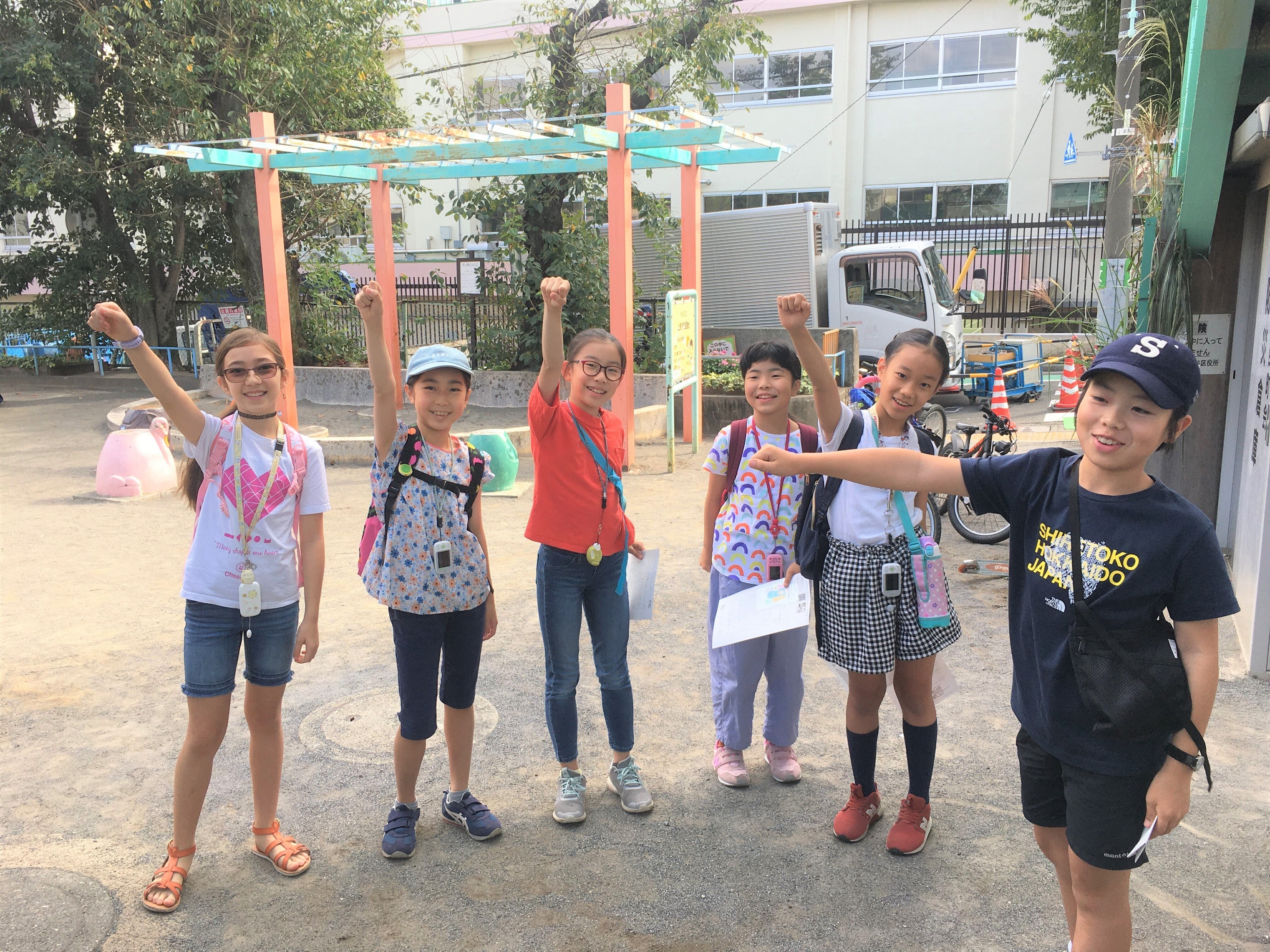 10月10日、小学校のお友達と一緒に、完成したステッカーを地元の商店会に貼ってもらうようお願いにまわりました。