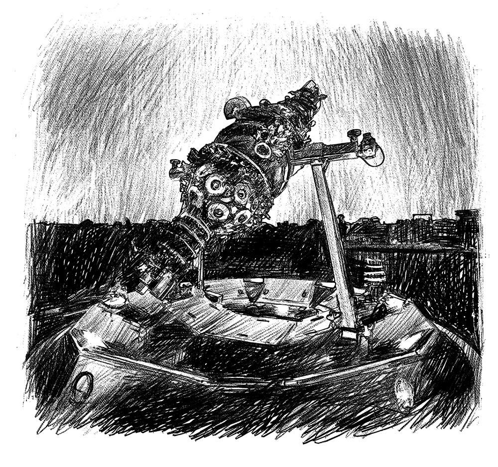 旧タイプのプラネタリウム投影機を闘技場で戦うメカに