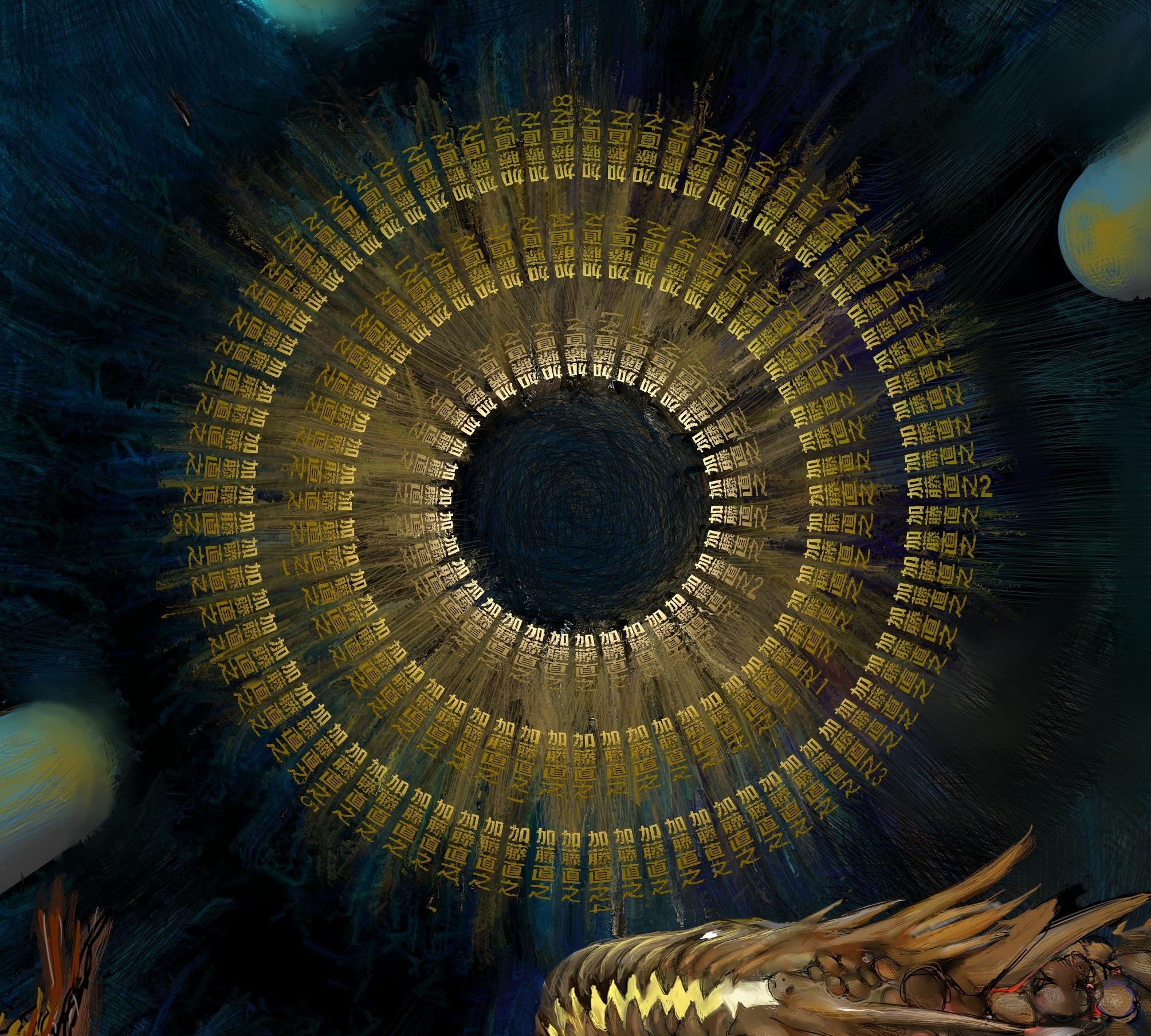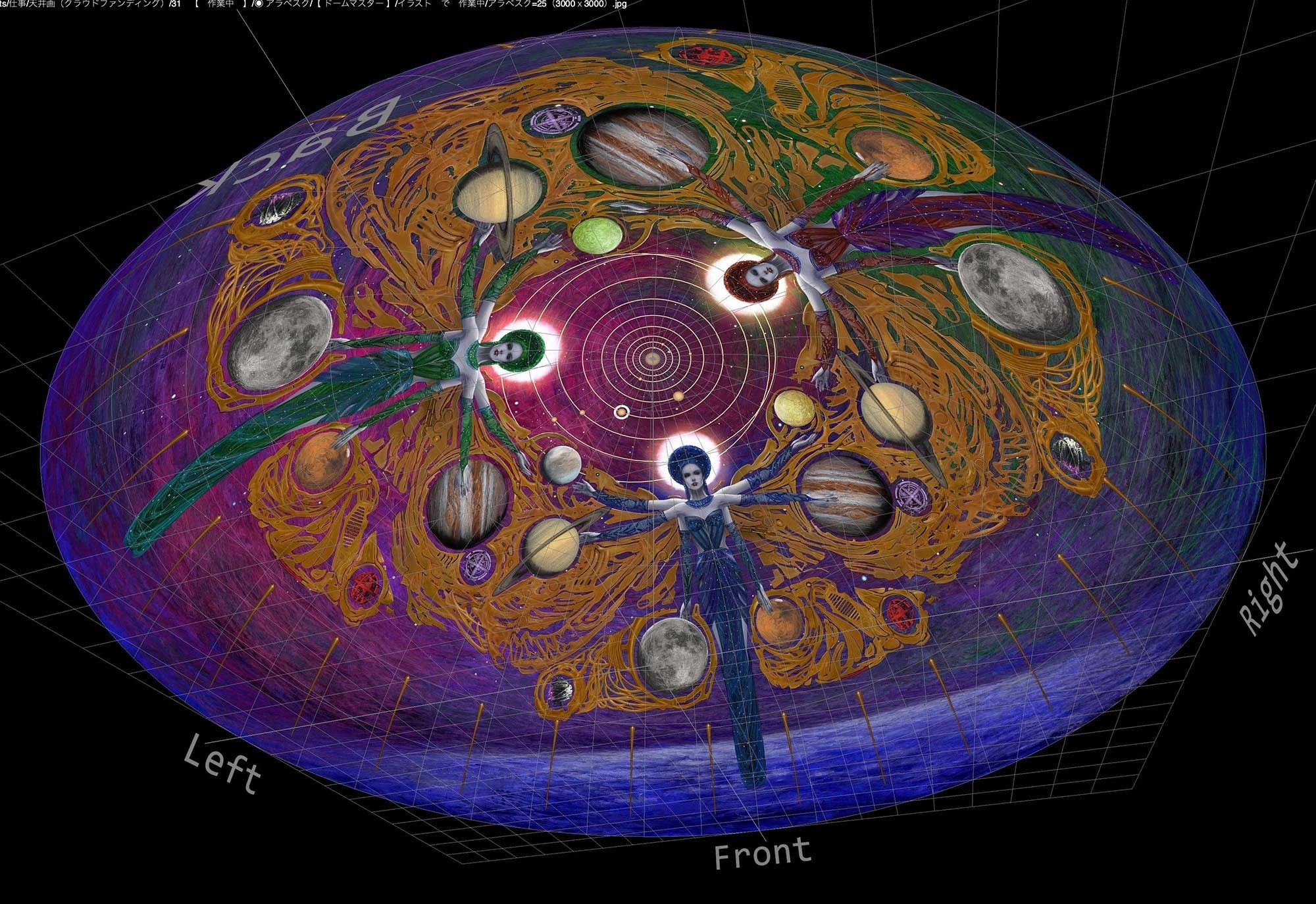 巨大ドームスクリーンにこんな絵が映し出されたら、これだけでも、けっこうプラネタリウム関係者に衝撃をあたえられるとは思いませんか? 今回は、さらに、ドームのためだけに描いた、ドームならではの演出を加えた天井画を、クラウドファンディングで、仕上げたい!
