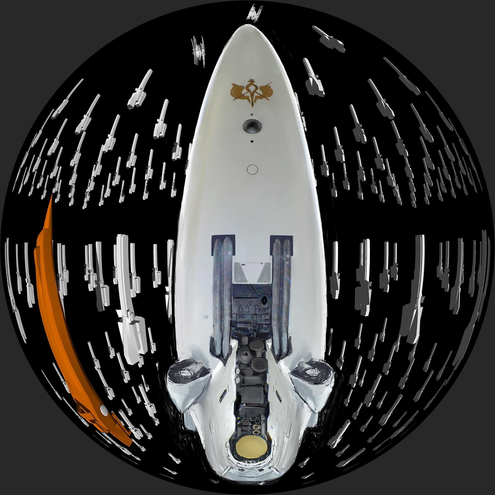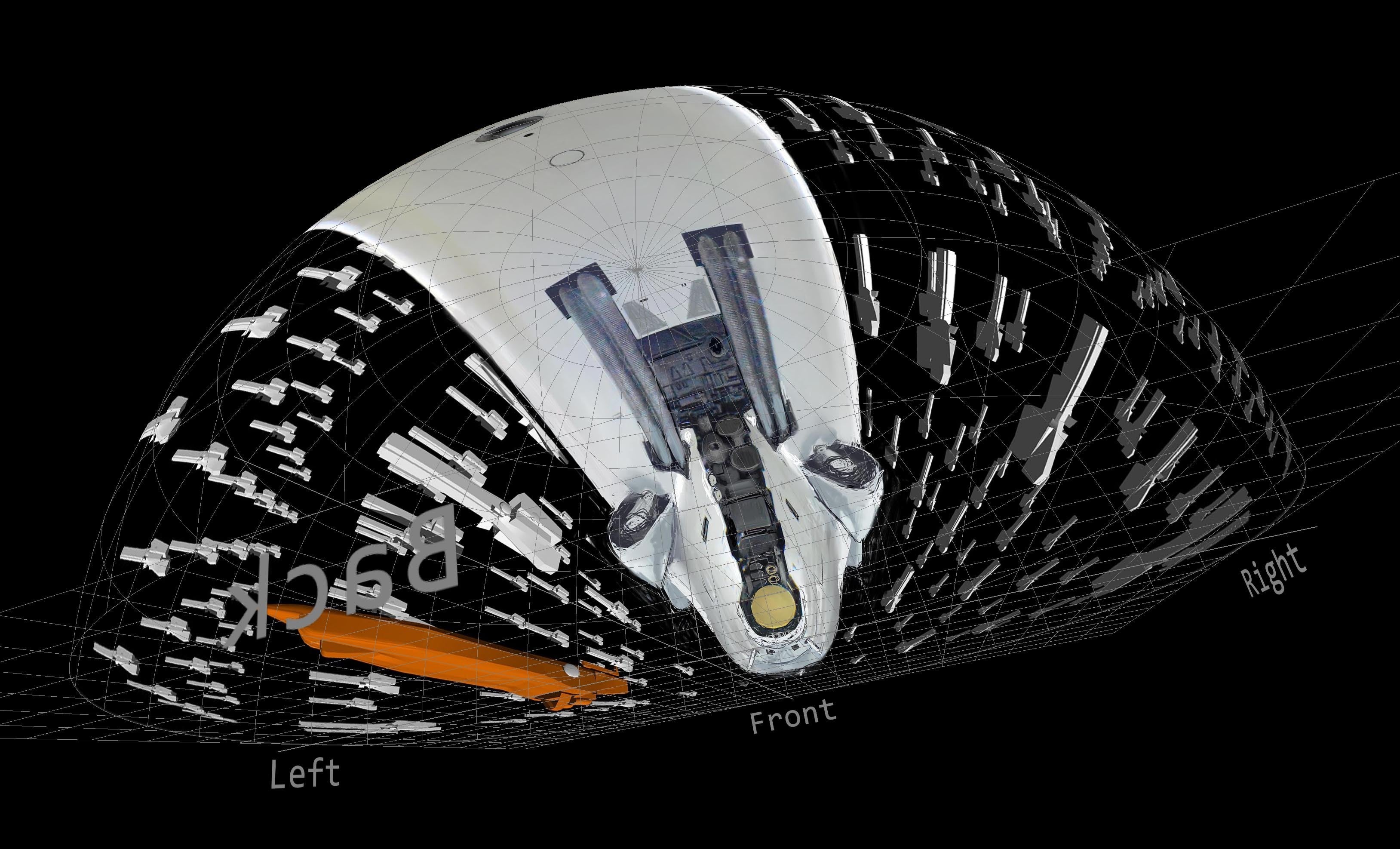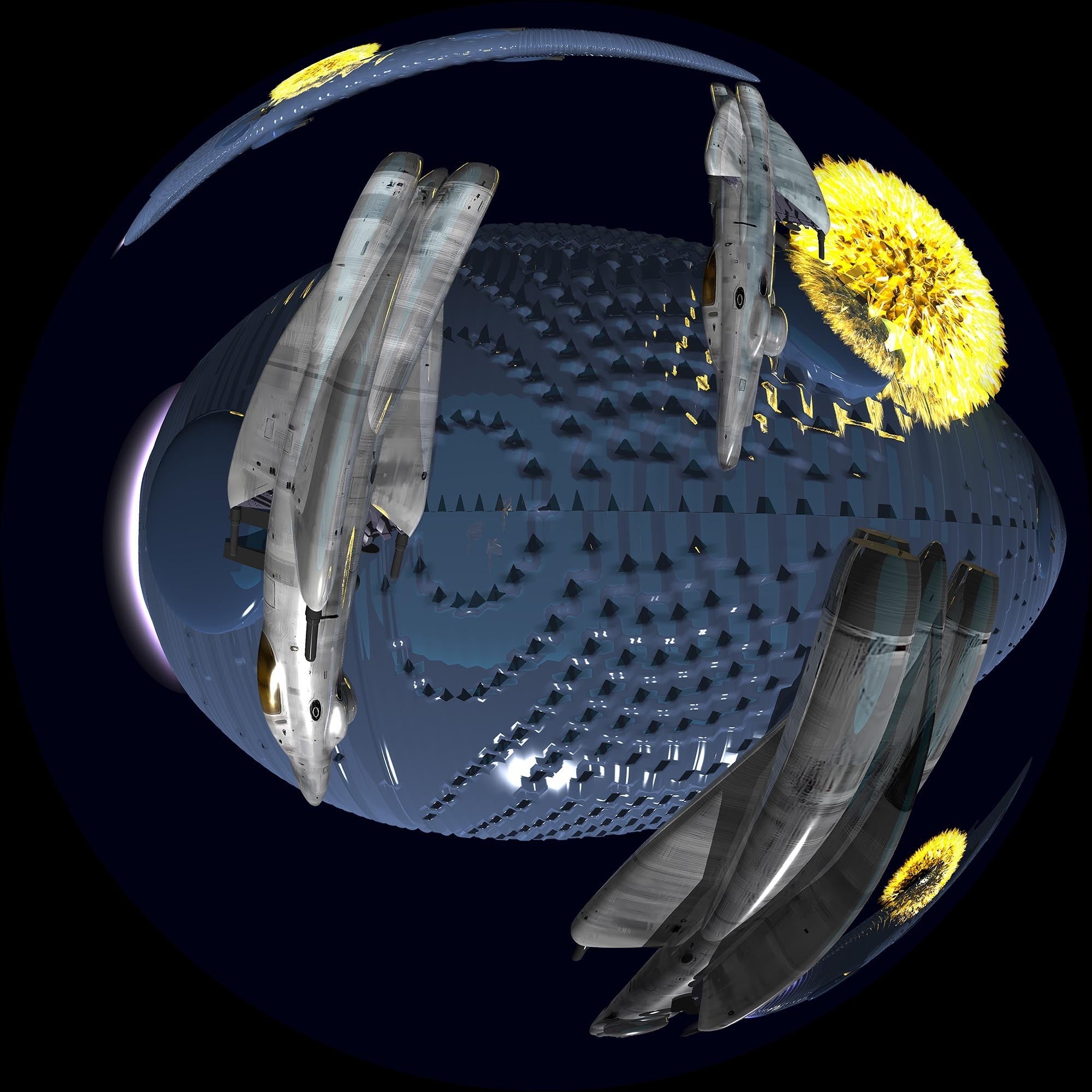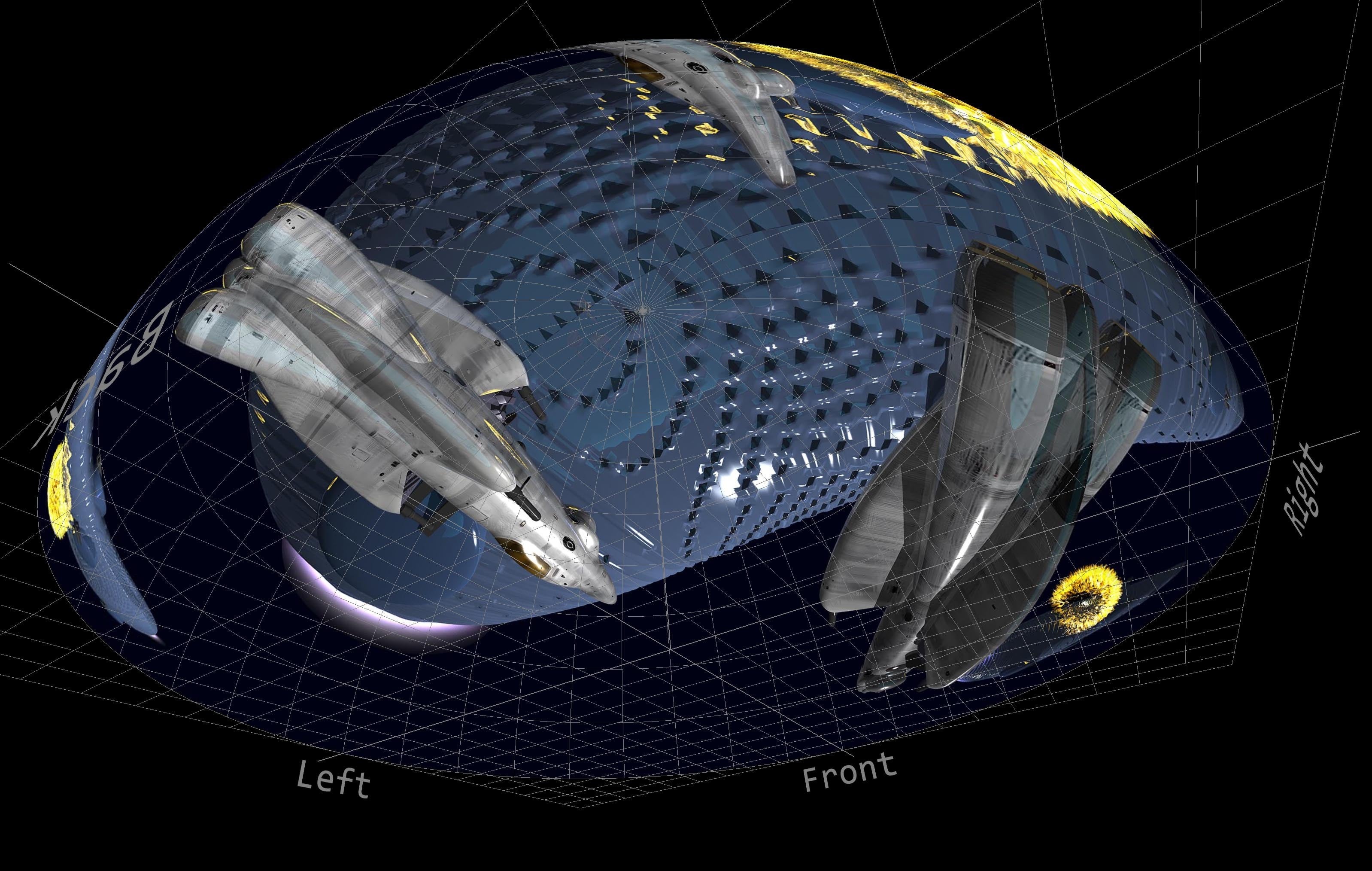 宇宙戦闘機、3機編隊と宇宙戦艦が行き交う宇宙空間をドームに表現します