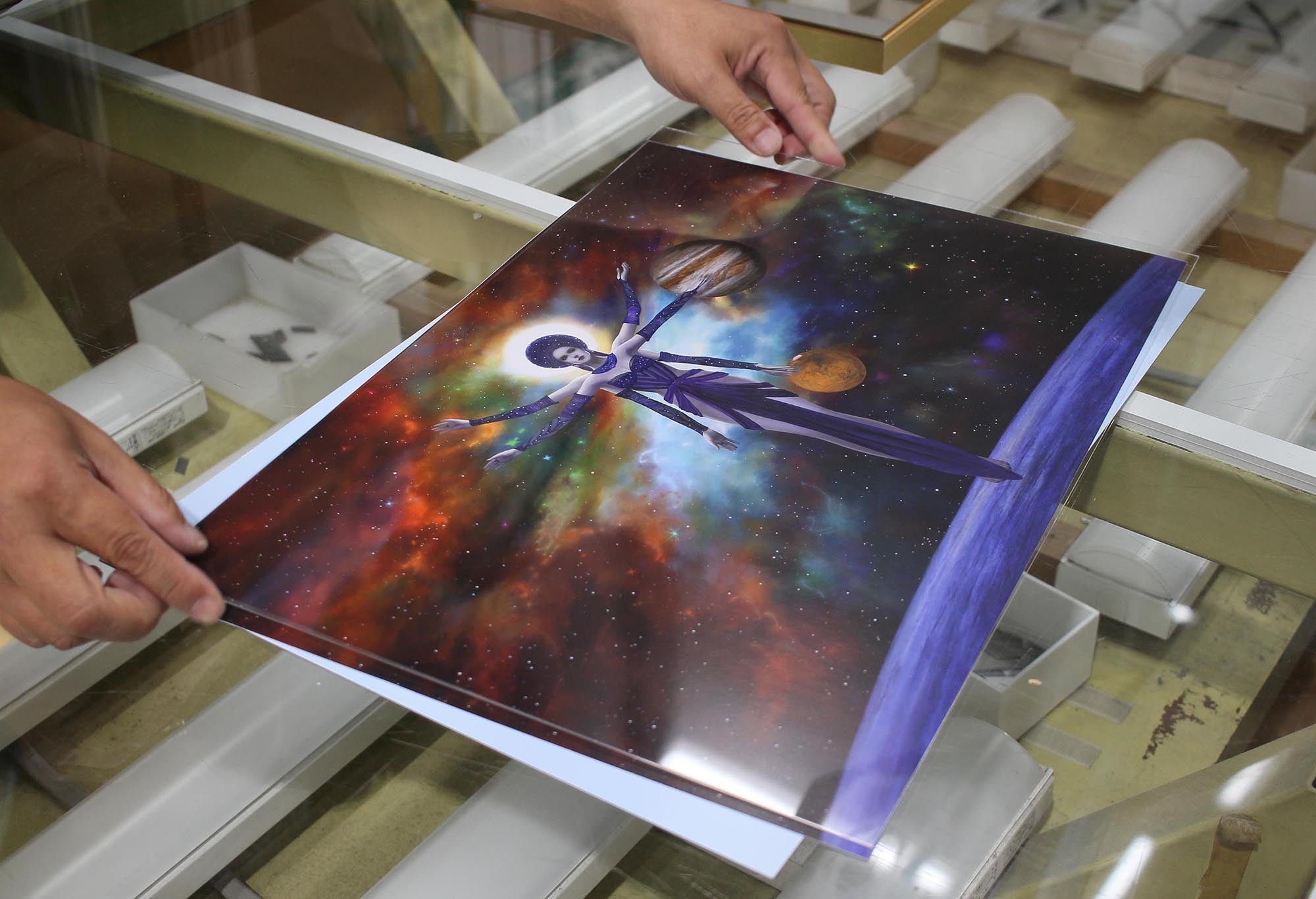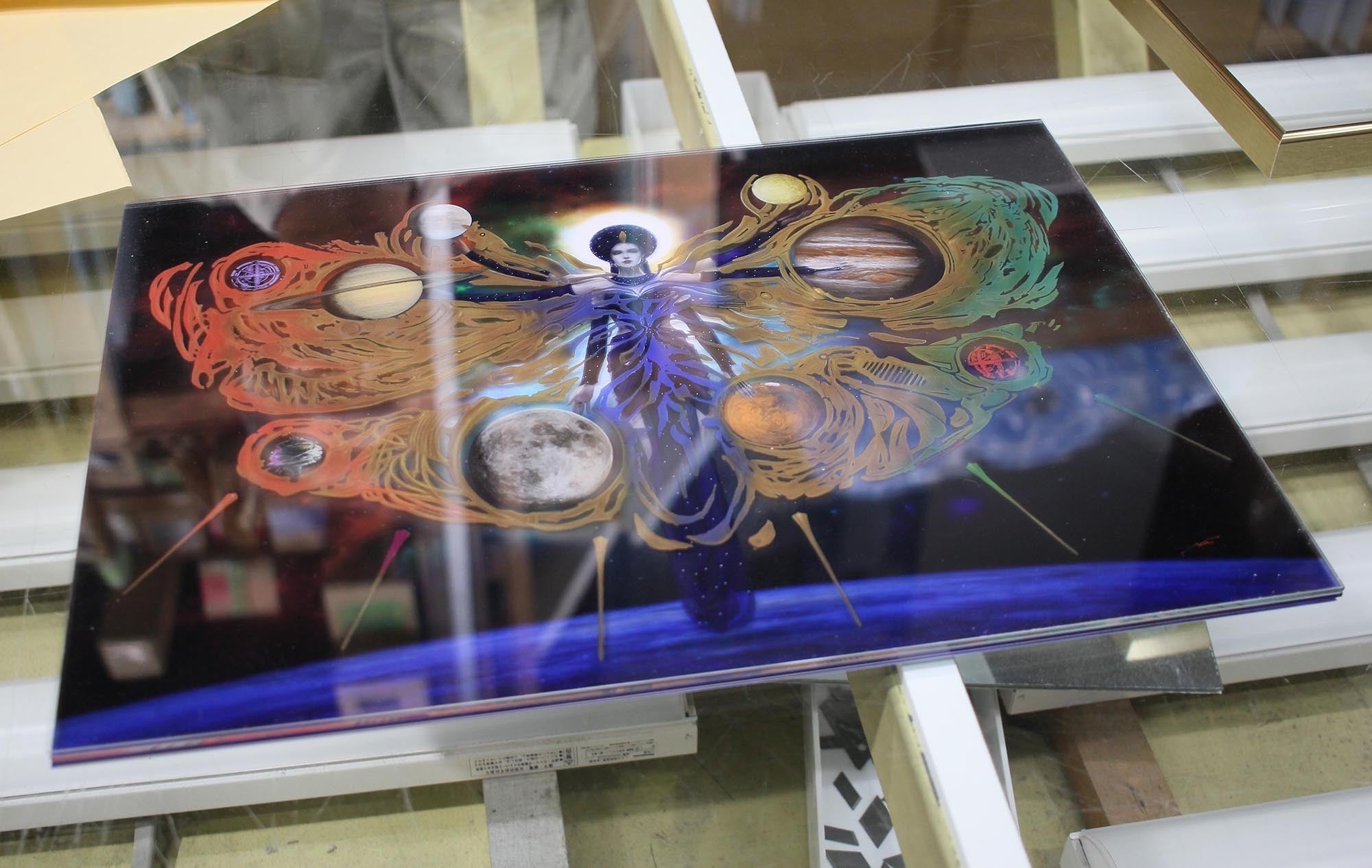 絵は3層構造。しかも上の層の絵の最後にプリントする白いインク(マスク)の濃さを調整して、重なる絵柄が透明な部分と不透明な部分をコントロールして奥行きを演出します。