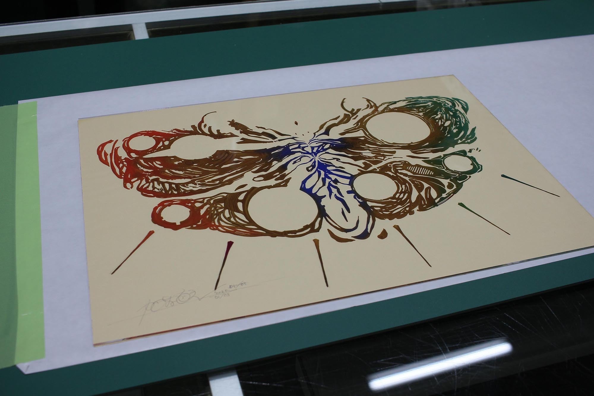 作者のサインは、リューターを使って、アクリル板に直接彫り込んでいます。