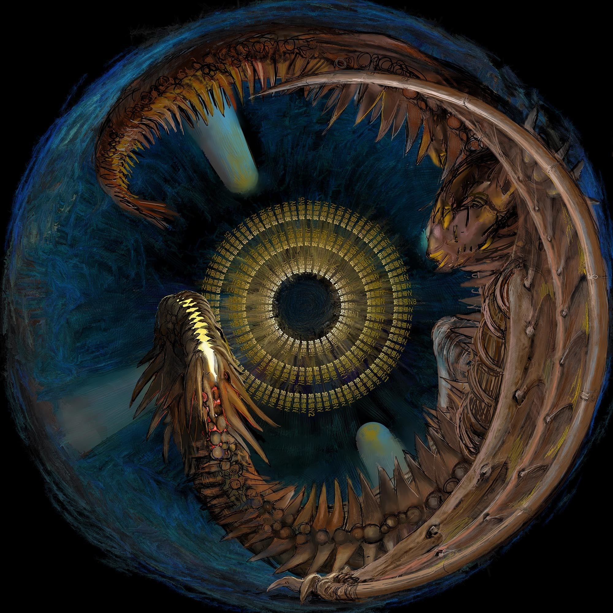 その結果、作品03『ドラゴンの洞窟』は、ドラゴンの頭を少し小さくして水平方向の奥行きを表現し、同時に、サンクスクレジットの面積をこれも縮小し、洞窟の天井が高くなるように修正しました。