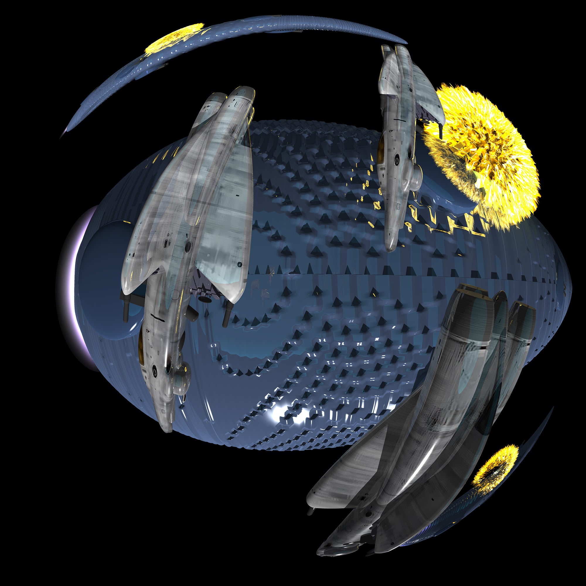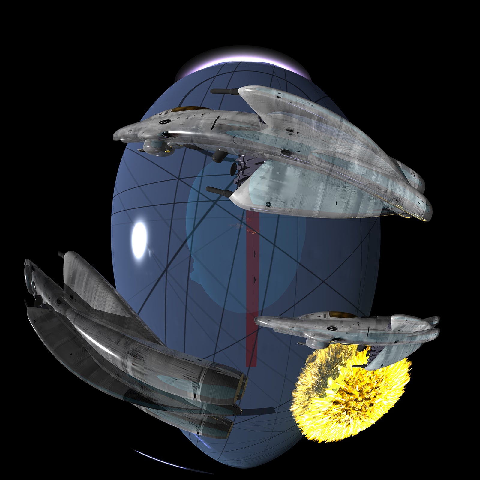戦艦の数を増やし、また、床が傾斜しているプラネタリウムには「前後」があるので、そういった前後のあるプラネタリウムでも「絵」の見え方(視線の誘導)に変化をつけるため、絵全体を左へ90度回転させることにしました。