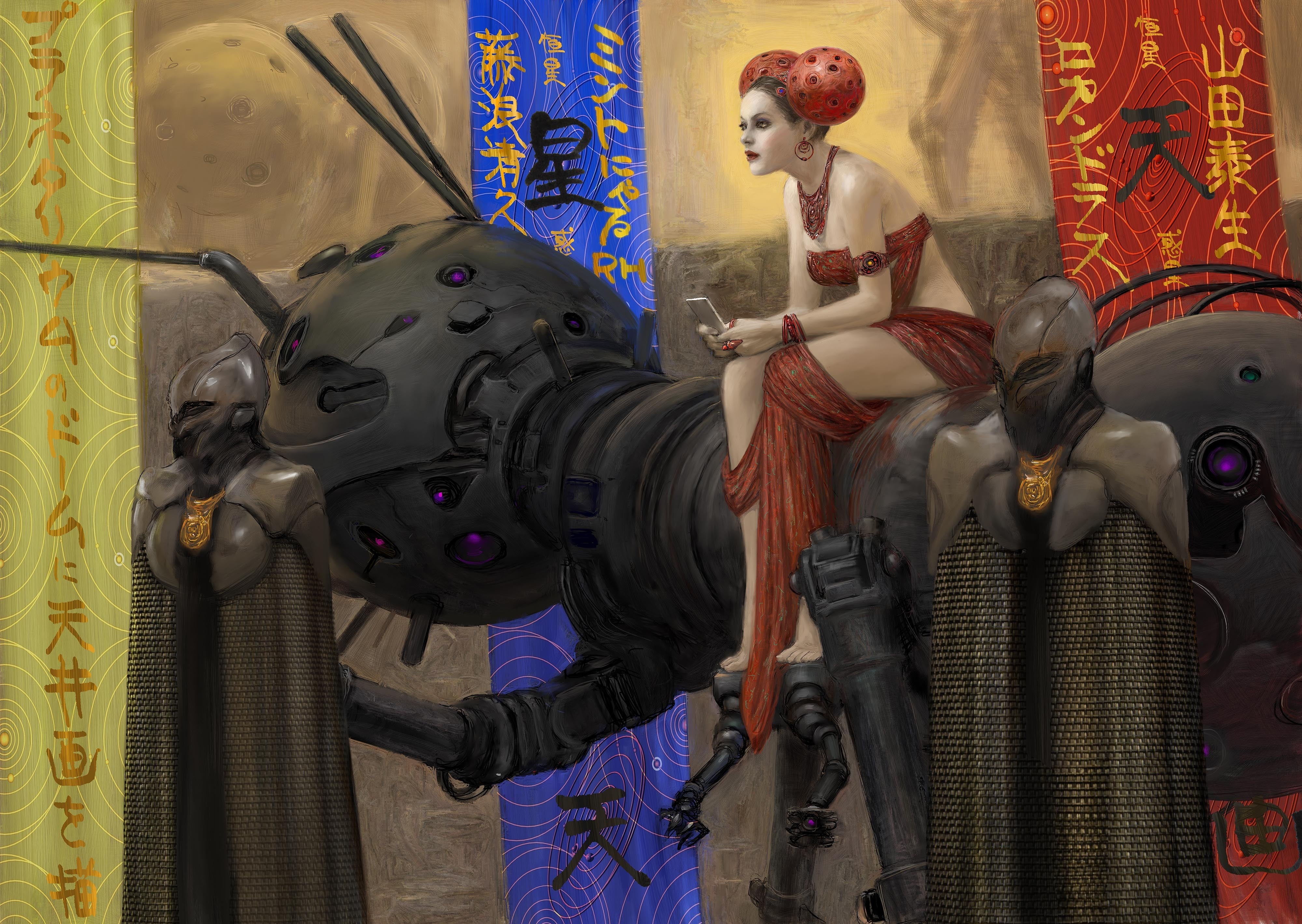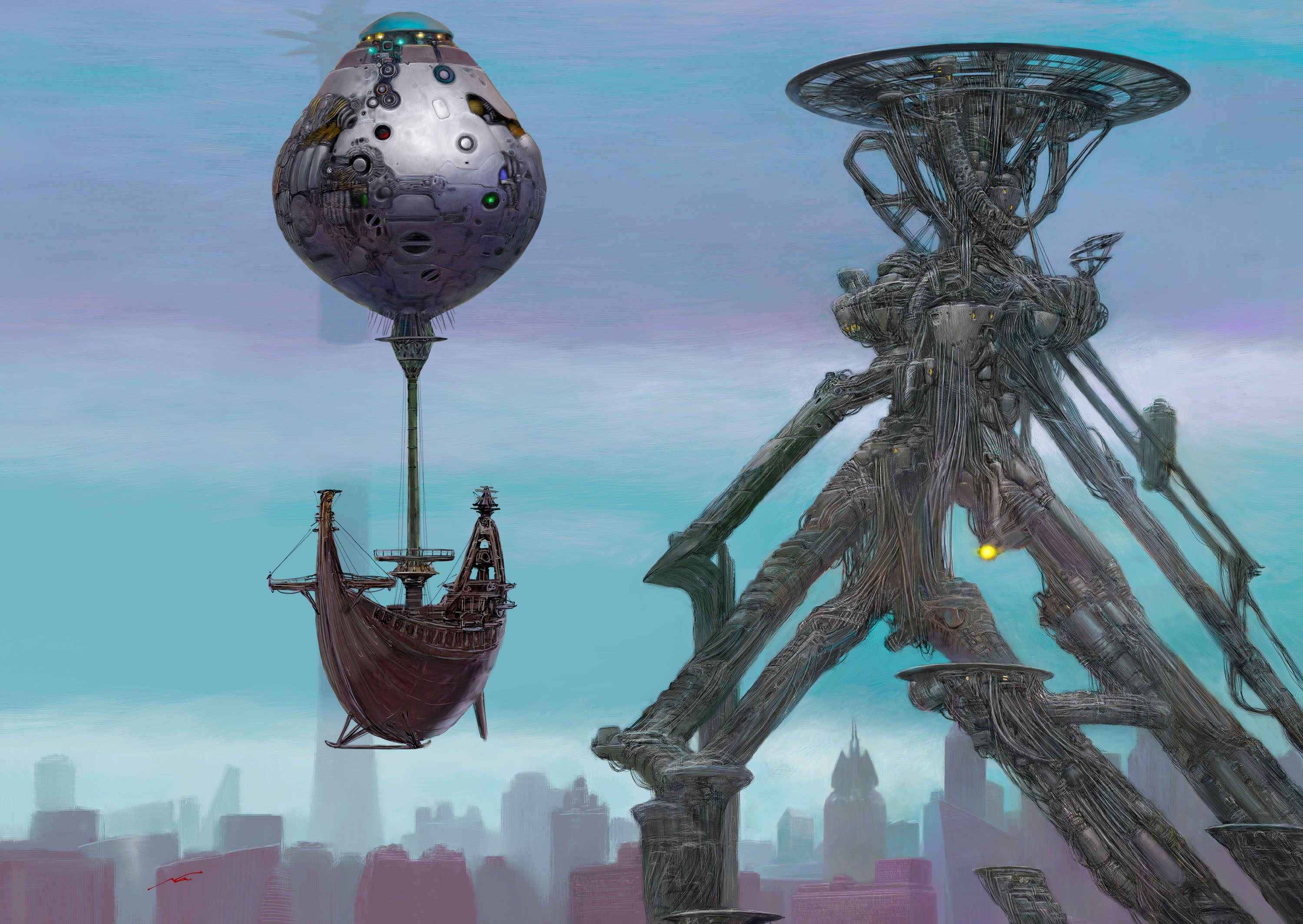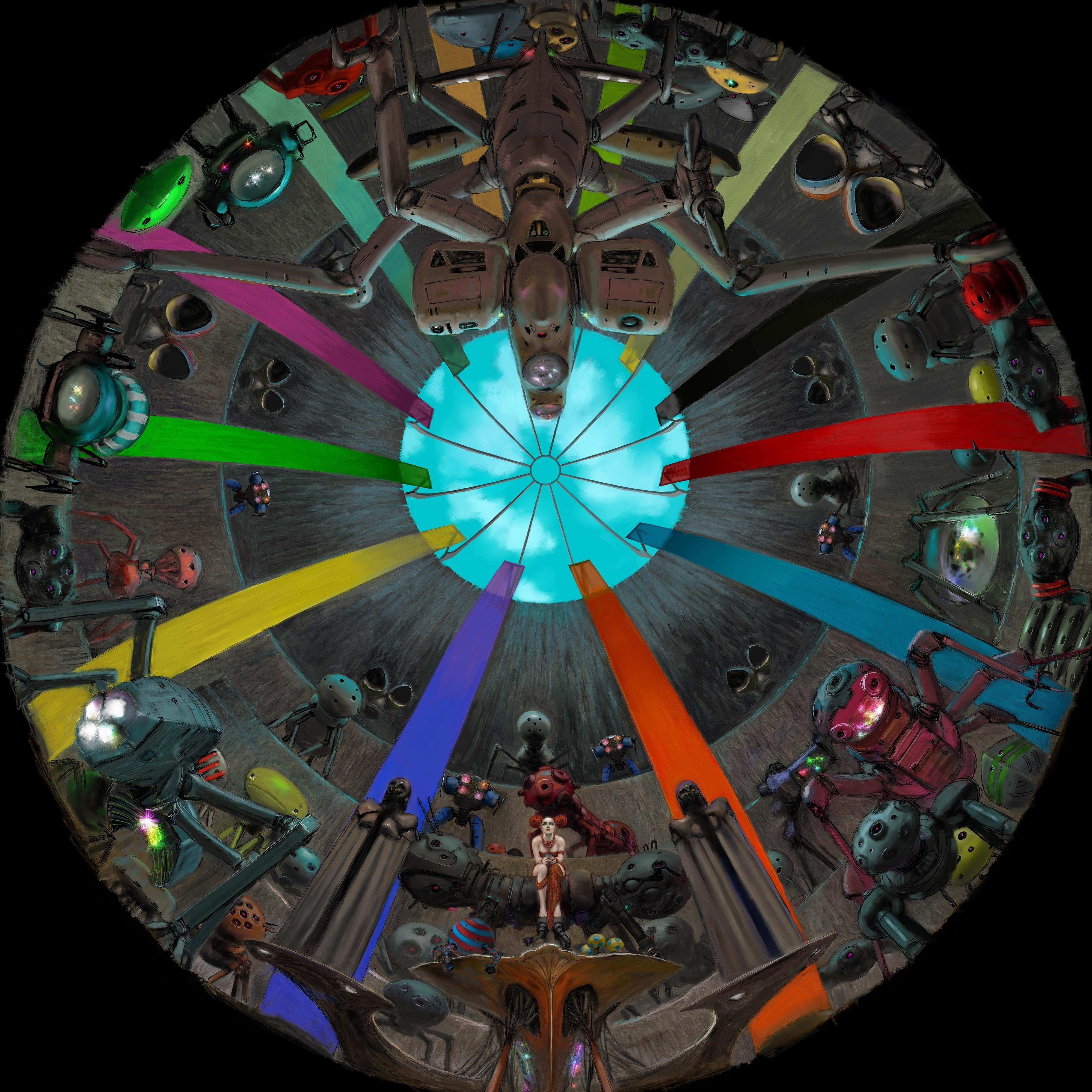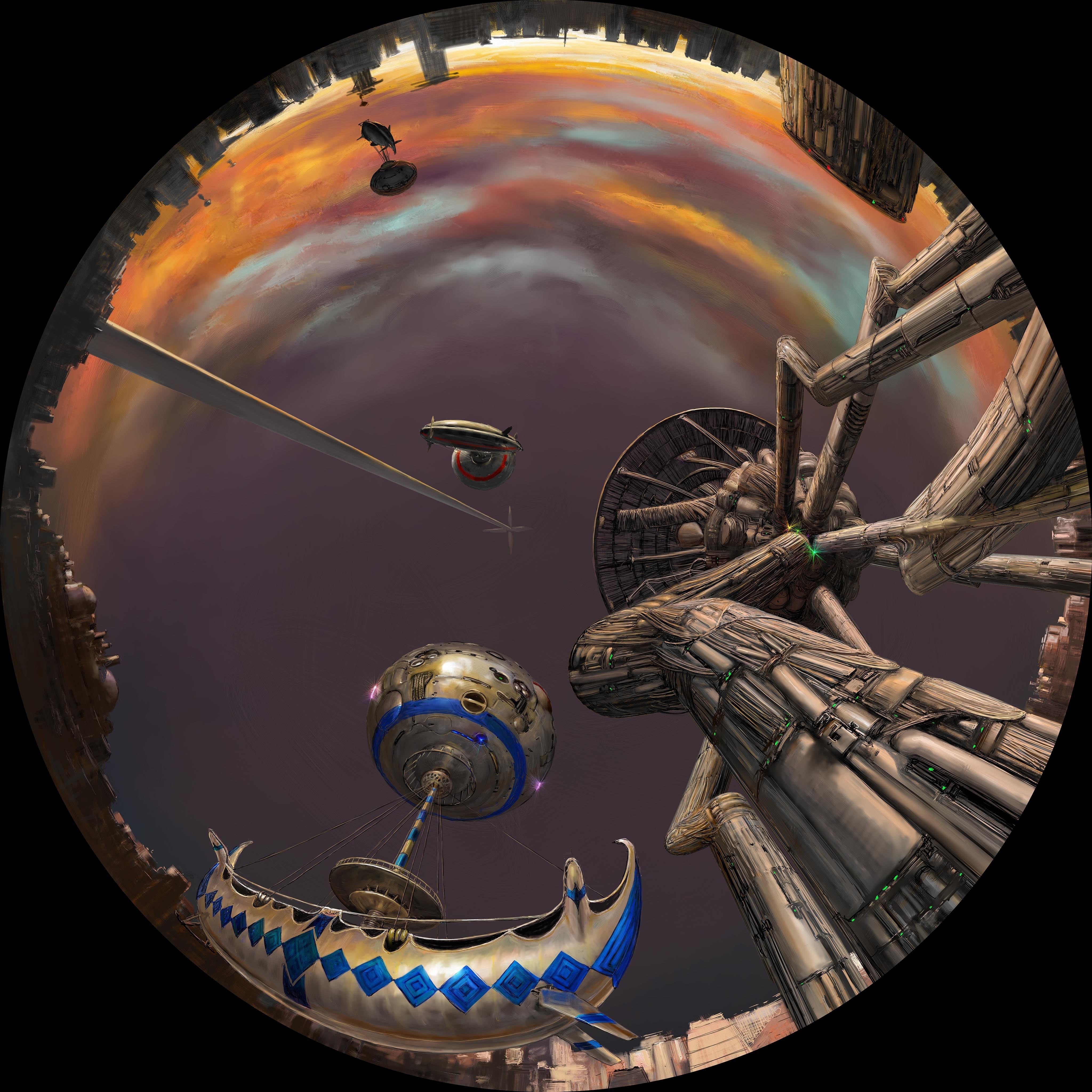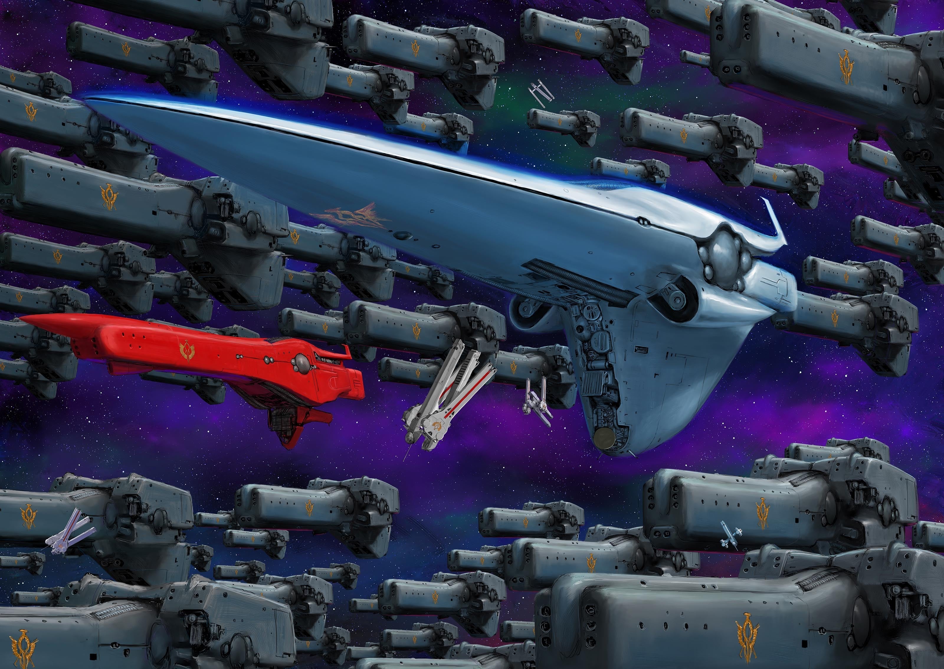 イメージイラストは、リターンでお送りするA4クリアファイルのためのイラストです。構図やアイデアは(イメージイラストでも)実際にドームに投影する「ドームマスター形式画像」と同じように、ブリュンヒルトの周りに帝国標準型戦艦の艦隊をグリッド状に配置する予定でしたが、描いている途中で、同じ向きの同じ大きさの戦艦をいっぱい並べて描くのが面倒くさくなってしまい、また、いぜん、銀河英雄伝説展のときの描き下ろし作品『イゼルローン要塞とヒューベリオン』でも似通った絵を描いていたことから、今回の、帝国のブリュンヒルトの絵では、標準型戦艦の艦隊は少しランダムな隊形を取らせることにしました。『イゼルローン要塞とヒューベリオン』しかし、単純に艦隊の隊列を変更するだけでは、絵の物語としての背景に深みが出ません。そこで、少し趣を変えて、戦闘時ではなく「ラインハルトが近衛艦隊の艦長たちを旗艦ブリュンヒルトに招くために、周りに標準型戦艦を呼び寄せた」という場面にしました。また絵として、戦艦だけでは面白くないので、最初からブリュンヒルトのそばにワルキューレを描きこむことにしていたのですが、ここでなぜワルキューレが登場するかの理由付けにもなります。つまり、「近衛艦隊の艦長たちは、自らワルキューレを操縦してブリュンヒルトとの間を行き来する」のです。このようにして、今回のイメージイラストの方向性が決まることになったのです。