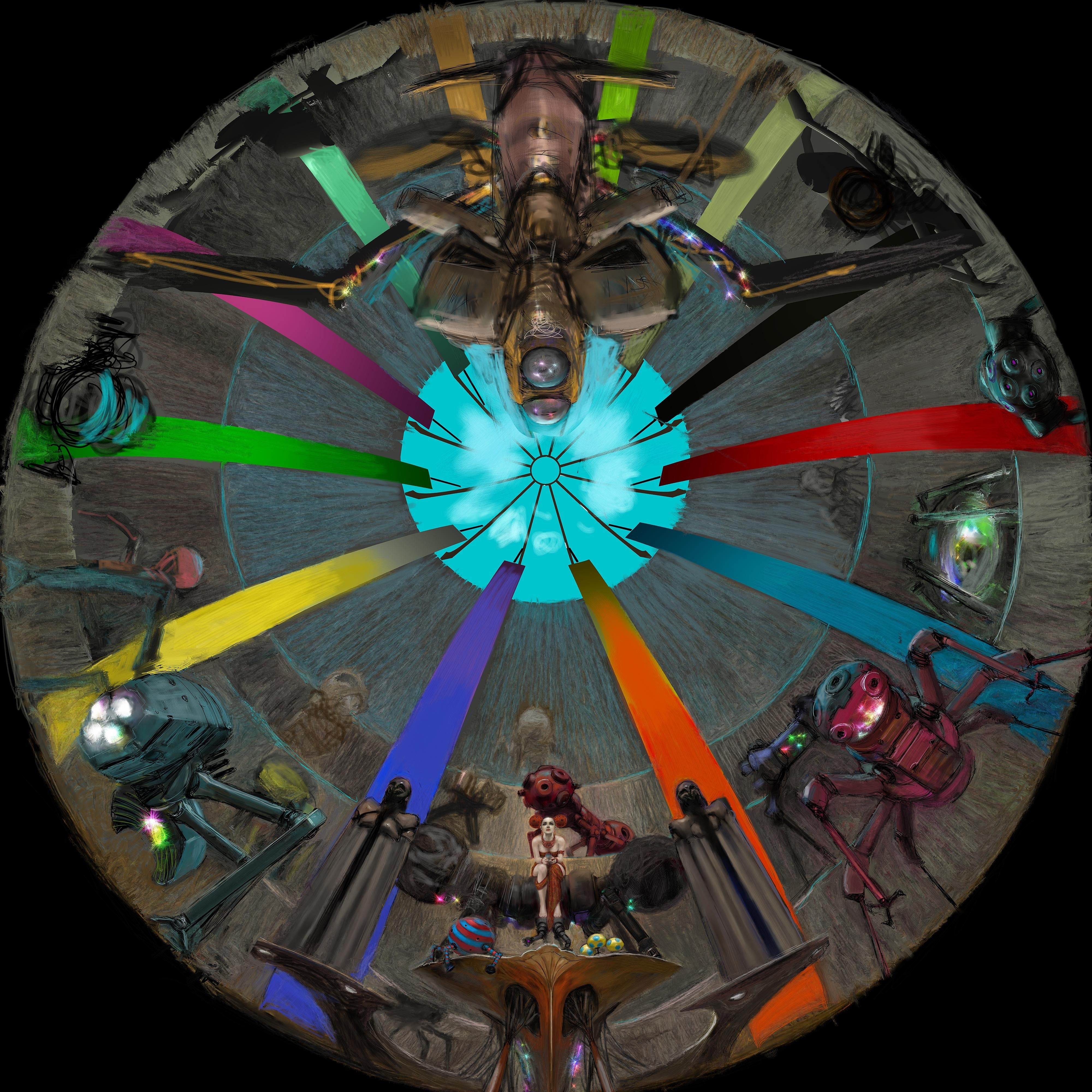 名入れサービス用イラスト(その2)です。主に漢字が似合う支援者様の名前を配置します。そのイメージイラストが(ほぼ)完成しました(あとはお名前を入れるだけ)。というわけで、ドームに投影するドームマスター形式の画像に取り掛かりました。ドームマスター形式の画像は、実際にドームに投影するため、ドームに最適化された画像としていろいろ歪みなどを補正することになります。身体は少し横幅を誇張(太め)して描いています。ドームに投影すると、これがほっそりした体型になるのですね(アマテラスによるシミュレーション)。この女性(王女です)は、ドーム全体の中では小さく遠景に配置されます。ドームの巨大感を演出するためです。アマテラスでシミュレーション(全体)ドームマスター形式画像は、実際に投影すると、ドームの頂点近辺では、絵の歪みは殆ど出ませんが、ドーム周辺(下の方)では、円形はきちんとした円形にはならず、少し平たい楕円形になってしまいます。また下に行くほど、縦が長く伸びてしまいます。幾何学的な形状なら難しくはありませんが、人間の顔となると、全く違います。一度描いては歪みを確認し、修正していくことの繰り返しになります。でもうまく行ったときの喜びもまたひとしおなのでありました。