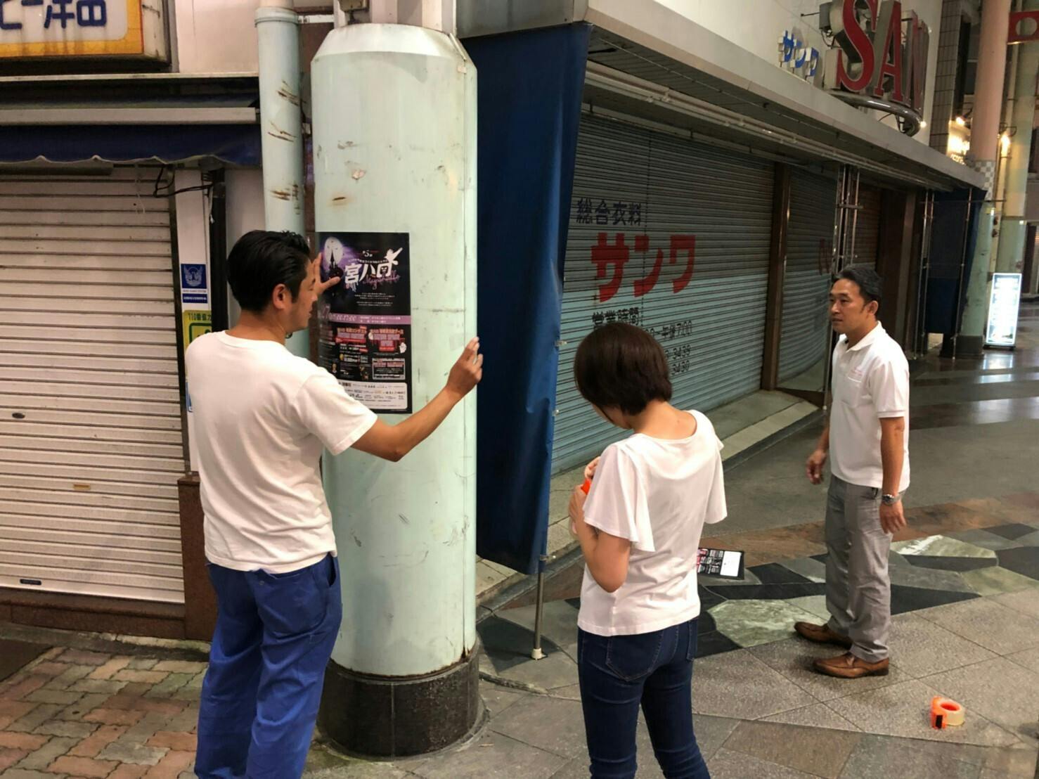 この写真は委員長である飯塚さんと各スタッフが開催場所のオリオン通りの中の柱にポスターを貼っているところです、何枚貼ったんでしょうか15枚くらいかなぁ。