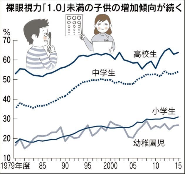 子供たちの視力低下が止まらない。文部科学省がまとめた2015年度の学校保健統計調査(速報)によると、裸眼視力が「1.0未満」の小学生の割合は30.9%と過去最高になった。幼稚園児も増加の傾向にあり、中高生は半数を超えている。専門家はスマートフォン(スマホ)や携帯ゲーム機などの長時間利用が視力の低下の一因とみている。