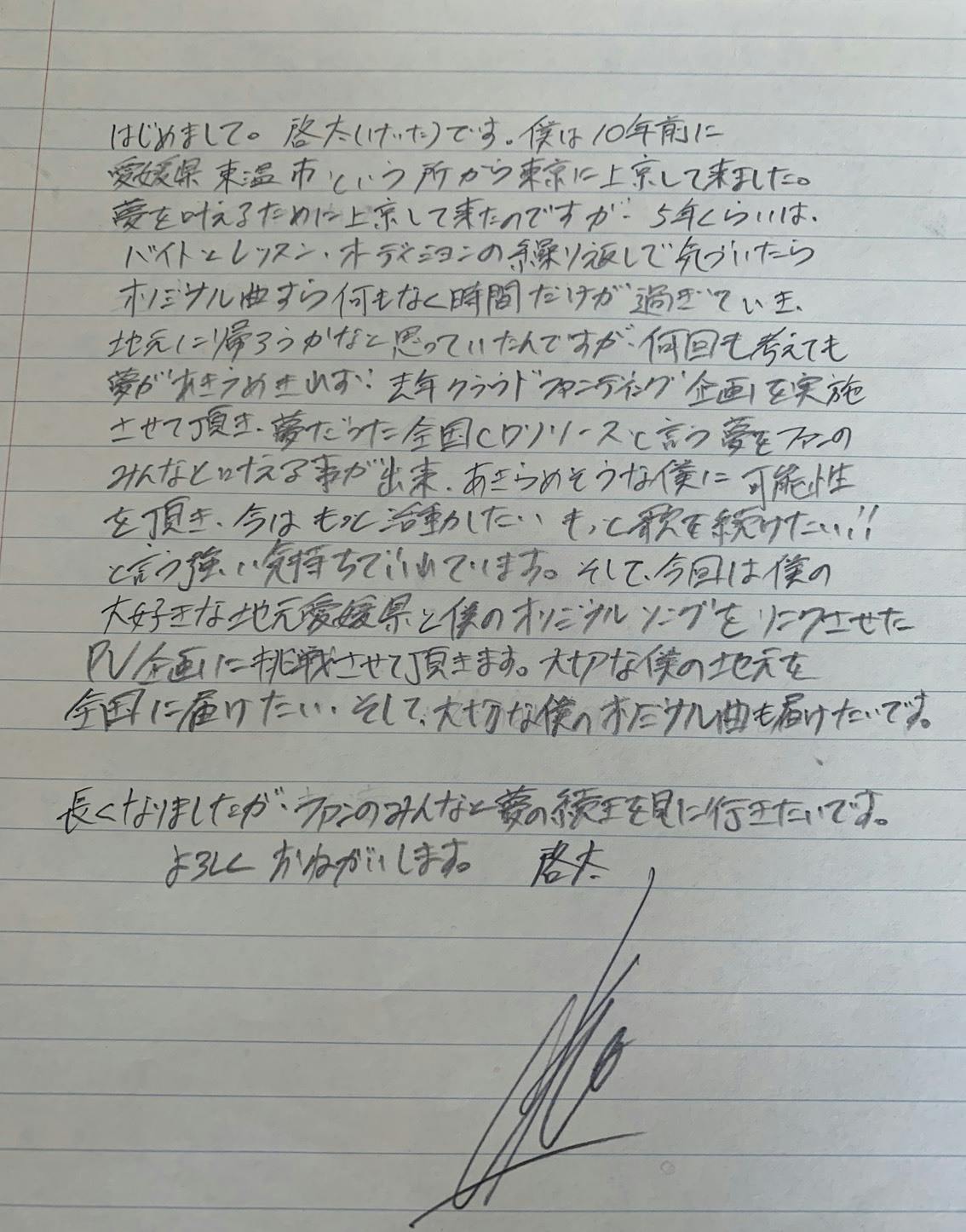 PV作成を叶えたくて挑戦しています。昔から育った地元、愛媛県の風景や街並みも使い、映像と歌の世界観がより沢山の人に伝えたいと思っています。