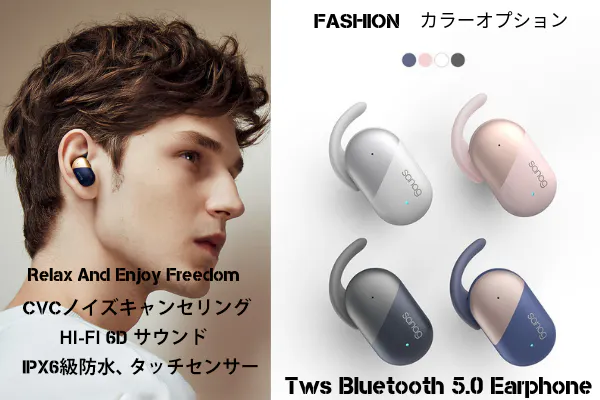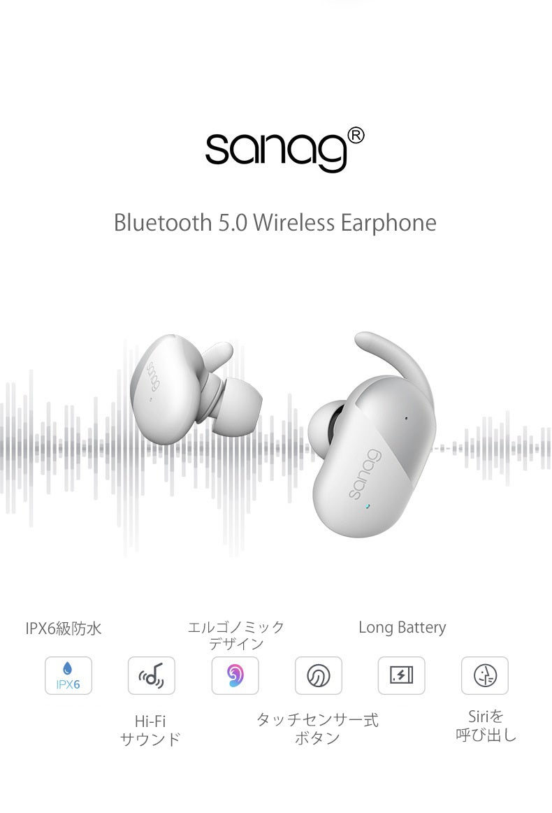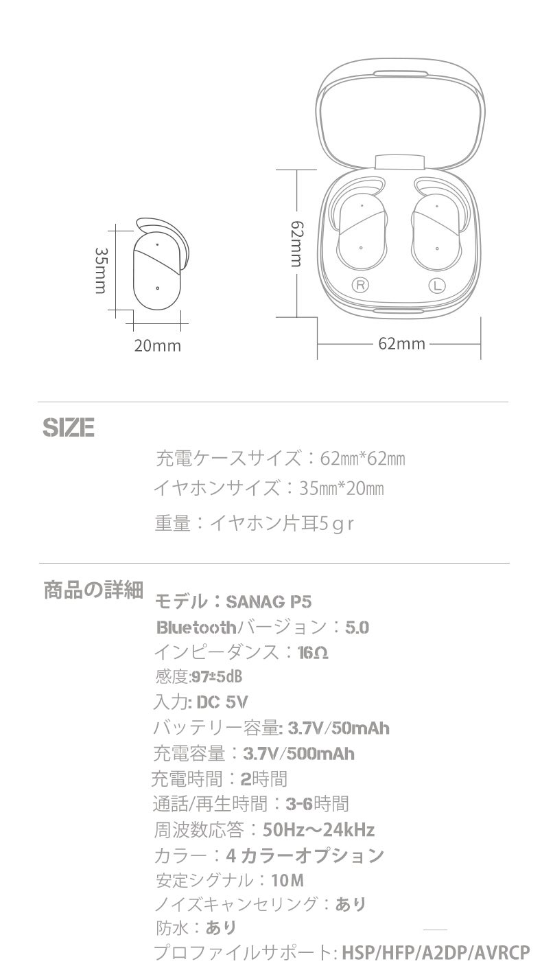 2019/06/27 12:44ブルートゥース5.0について :最近話題の最先端Bluetooth 5.0+EDRが搭載されたワイヤレスイヤホンです。特徴・転送速度が従来の2倍になり、ブロードキャスト通信容量が8倍に増大。まさに高速・安定かつ途切れのない接続体験を実感できるBluetooth イヤホンです。・先進技術アンテナなので、信号が強くなり、他のワイヤレス技術との干渉を減らし、ますます複雑化するワイヤレス環境でデバイスが共存できるようになりました。・IOSとAndroid両方とも互換性があります。IPX6級防水設計:IPX6級防水設計により、水の侵入を防ぎ、雨や汗を気にせず使用することができます。スポーツやランニングなどの運動に最適スポーツイヤホンです。※ご注意:充電ケースは防水仕様ではありません。人間工学に基づいた軽量設計で耳にフィットし、アクティブに動いてもしっかりと耳にフィットする快適な装着感を実現します。長時間つけていても少し耳が痛くなることもなく気軽に使えます。サウンドについて:ダイナミックドライバー、クリアでリッチな高音質!SANAG P5は、音楽や映画などの様々なサウンドを、 本格的な響きであなたの耳に届けます。 どの音域もクリアな高音質でバランスがよく聞きやすくなっていま す。チタンメッキ振動板について: SANAG P5は軽量で強度の高い高純度チタンメッキ振動板を使用しており、音波の振動によって音楽が歪むことはなく、クリアでリッチな高音質を表現することができます。コンフォートについて:Sanag P5は、全てのスポーツシーンで相性が良いです。どんな時でも活躍します。とくに移動中、ハイキング、ランニング、ジムなど、自転車に乗りながら音楽を楽しむことができます。スポーツしながら音楽を聞いたり、電話をしたりすることが完全にできます。仕事や作業に集中したい時にもおすすめです。大きな音の音楽での遮断はコミュニケーションをロスしてしまう可能性があります 。CVCノイズキャンセリング:CVC 8.0ノイズキャンセリングを採用しており、通話中の雑音や周囲のノイズをしっかり抑制し、純音信号をそのまま高速転送でHiFi高音質を実現できます。充電&充電ボックスについて:※イヤホンを1回の充電で約3-6h音楽を楽しめ、急速充電機能付き、1時間で満タンになります。※音量や、電波状況、使用環境などにより、多少異なる場合がございますので、ご了承ください。フル充電されると自動的に充電が止まるので過充電を防止します。充電&充電ボックスについて:※イヤホンを1回の充電で約3-6h音楽を楽しめ、急速充電機能付き、1時間で満タンになります。※音量や、電波状況、使用環境などにより、多少異なる場合がございますので、ご了承ください。フル充電されると自動的に充電が止まるので過充電を防止します。 もっと見る