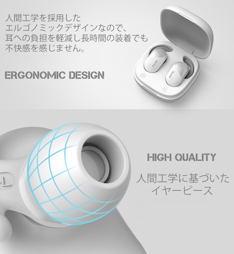 IPX6級防水設計により、水の侵入を防ぎ、雨や汗を気にせず使用することができます。スポーツやランニングなどの運動に最適スポーツイヤホンです。※ご注意:充電ケースは防水仕様ではありません。人間工学に基づいた軽量設計で耳にフィットし、アクティブに動いてもしっかりと耳にフィットする快適な装着感を実現します。長時間つけていても少し耳が痛くなることもなく気軽に使えます。