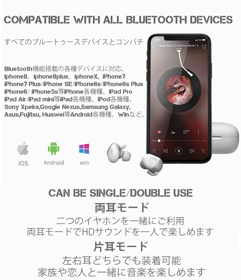 *ダイナミックドライバ *会話の度に音楽を止める必要ないTWS ワイヤレスイヤホン * 最新チップセットBluetooth 5.0 EDR、*タッチセンサー型、クリアな通話音質、*片耳モード|両耳モード、*スーパーミニ、スーパー軽い、*長期使用、HDハイファイ(Hi-fi)サウンド、*ダイナミックボカリズム、*CVCノイズリダクションテクノロジーで ノイズキャンセリング、Siriを呼び出し、*再生時間3-6時間、*待ち受け可能時間150時間、*IPX6级防水設計、*急速充電時間2時間、*感度97±5dB、* イヤホン片耳5gr