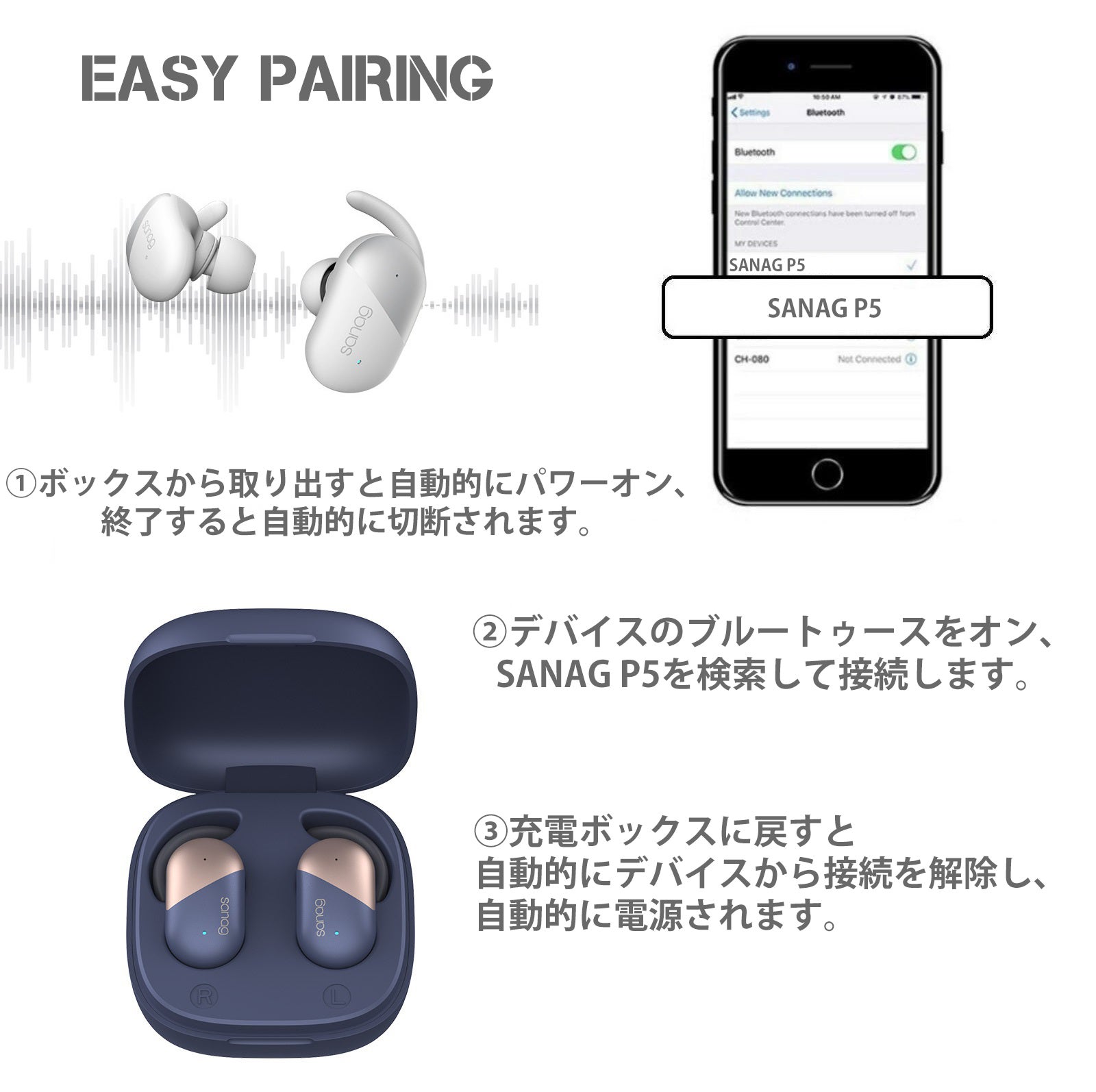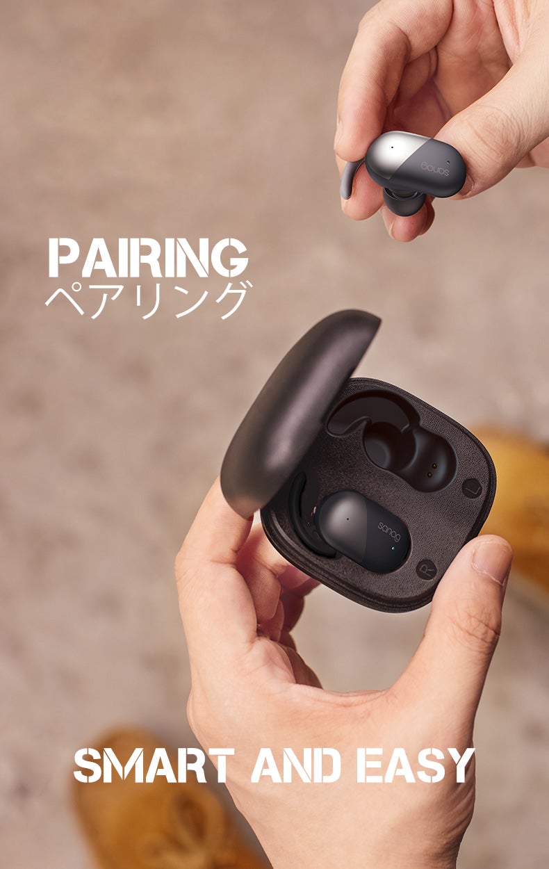 ・Sanag P5 を一度でもデバイスに接続すると、充電ボックスから取り出すたびに自動的にペアリングされます。