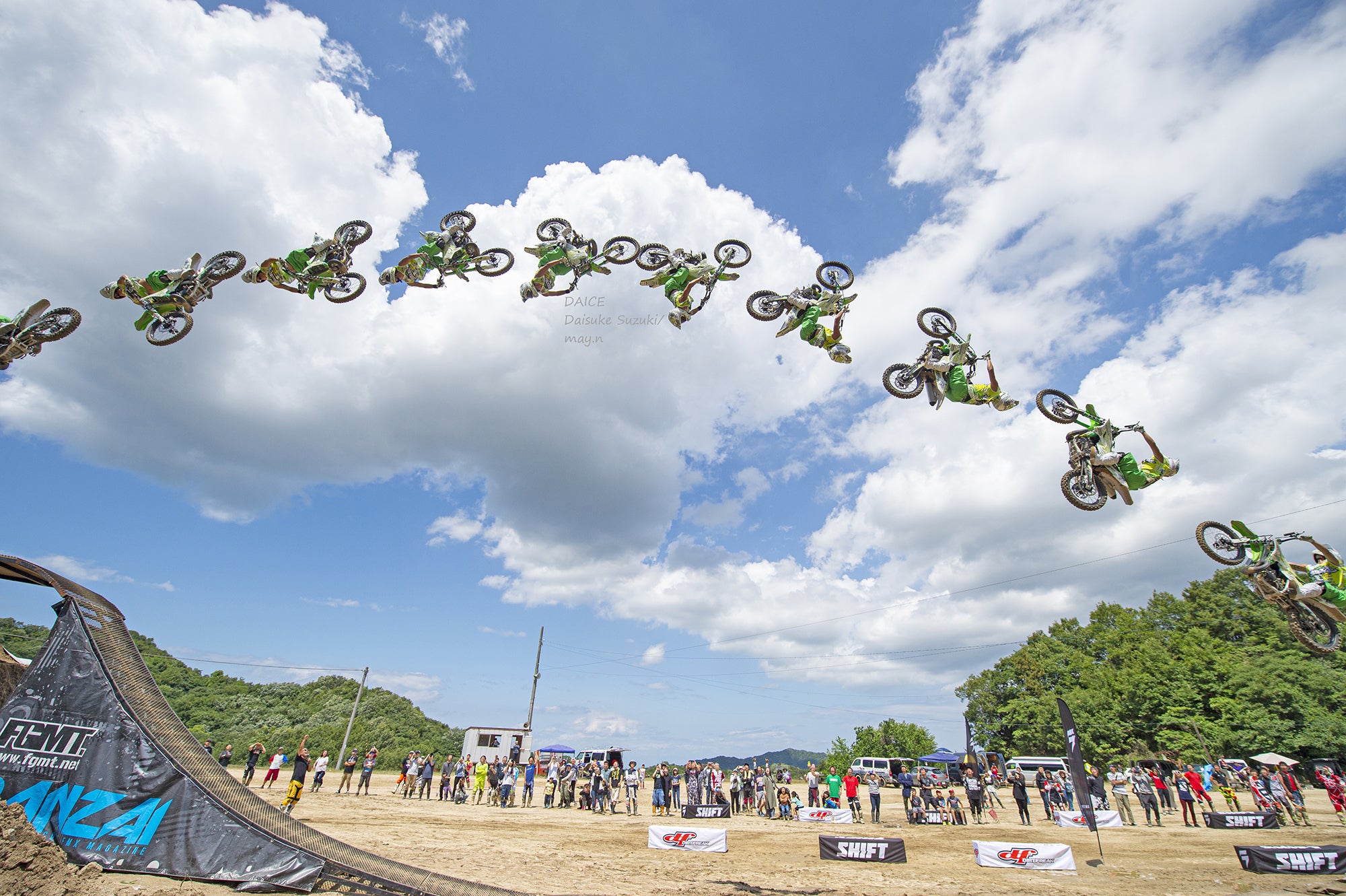 その23mを飛んでいる最中、様々な技(トリック)を魅せるのがフリースタイルモトクロスです。