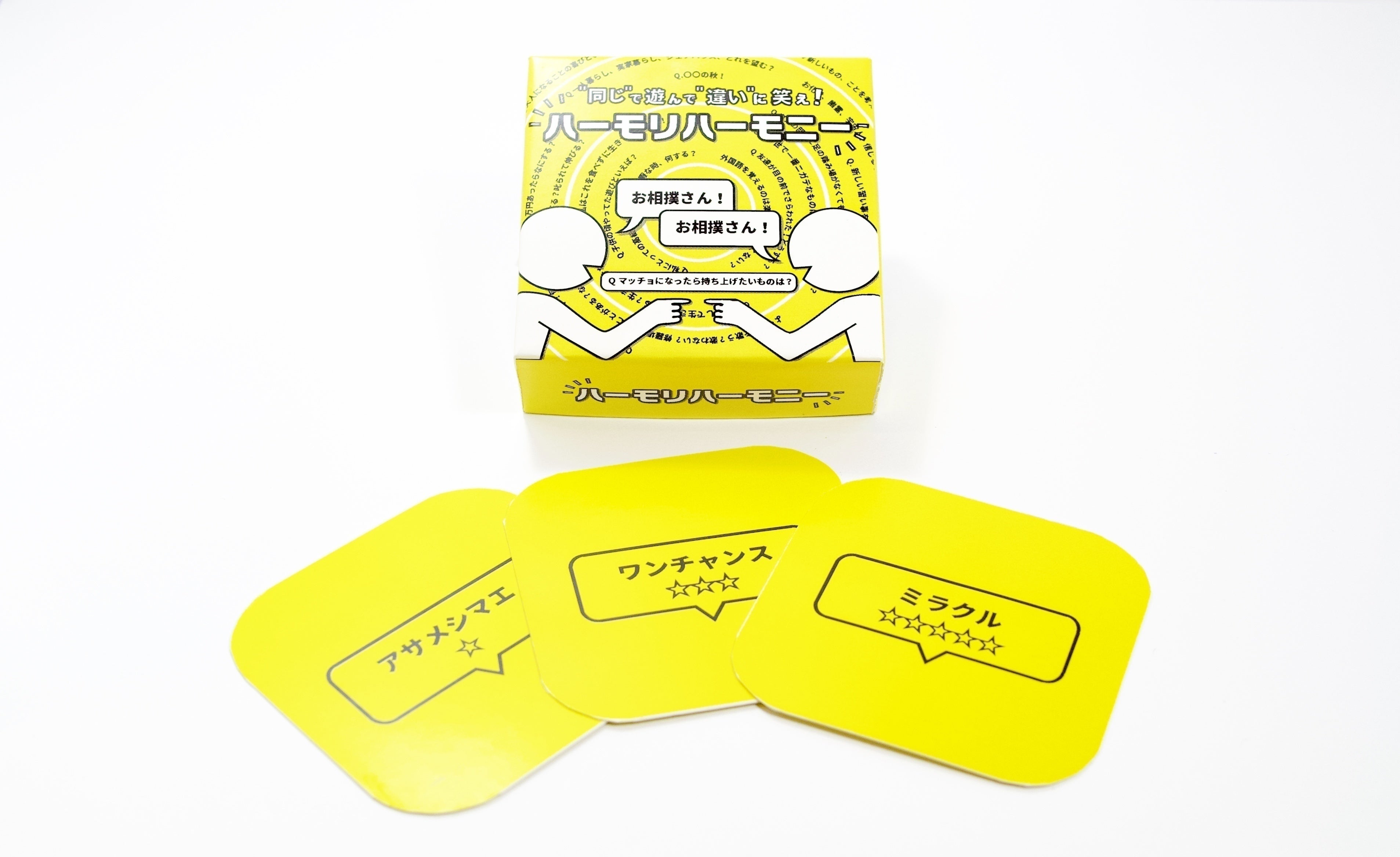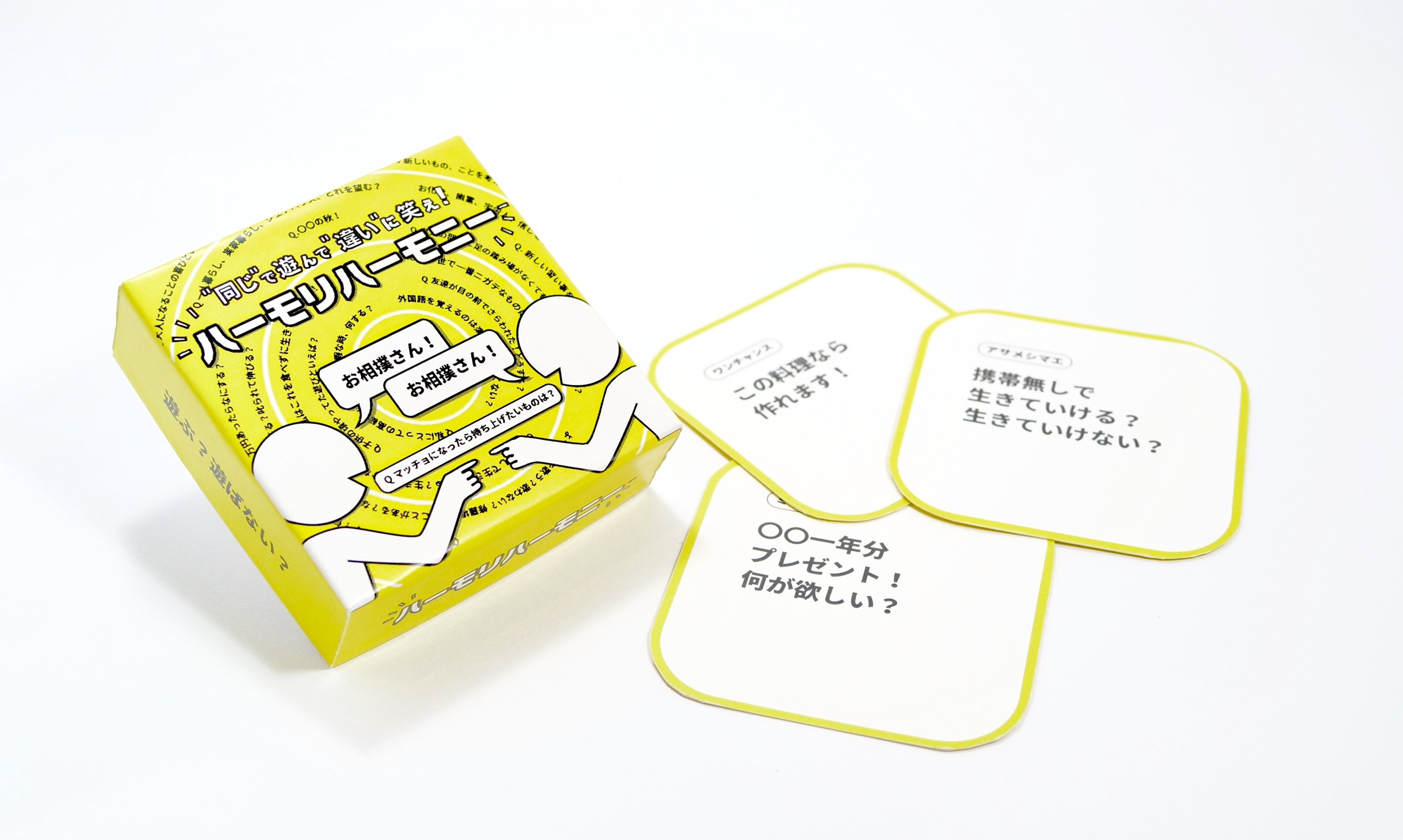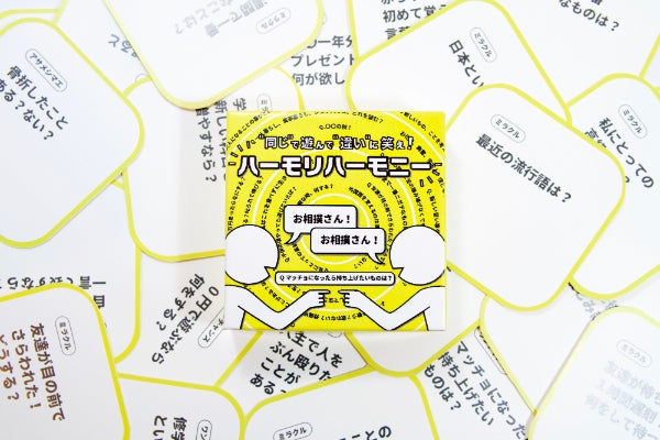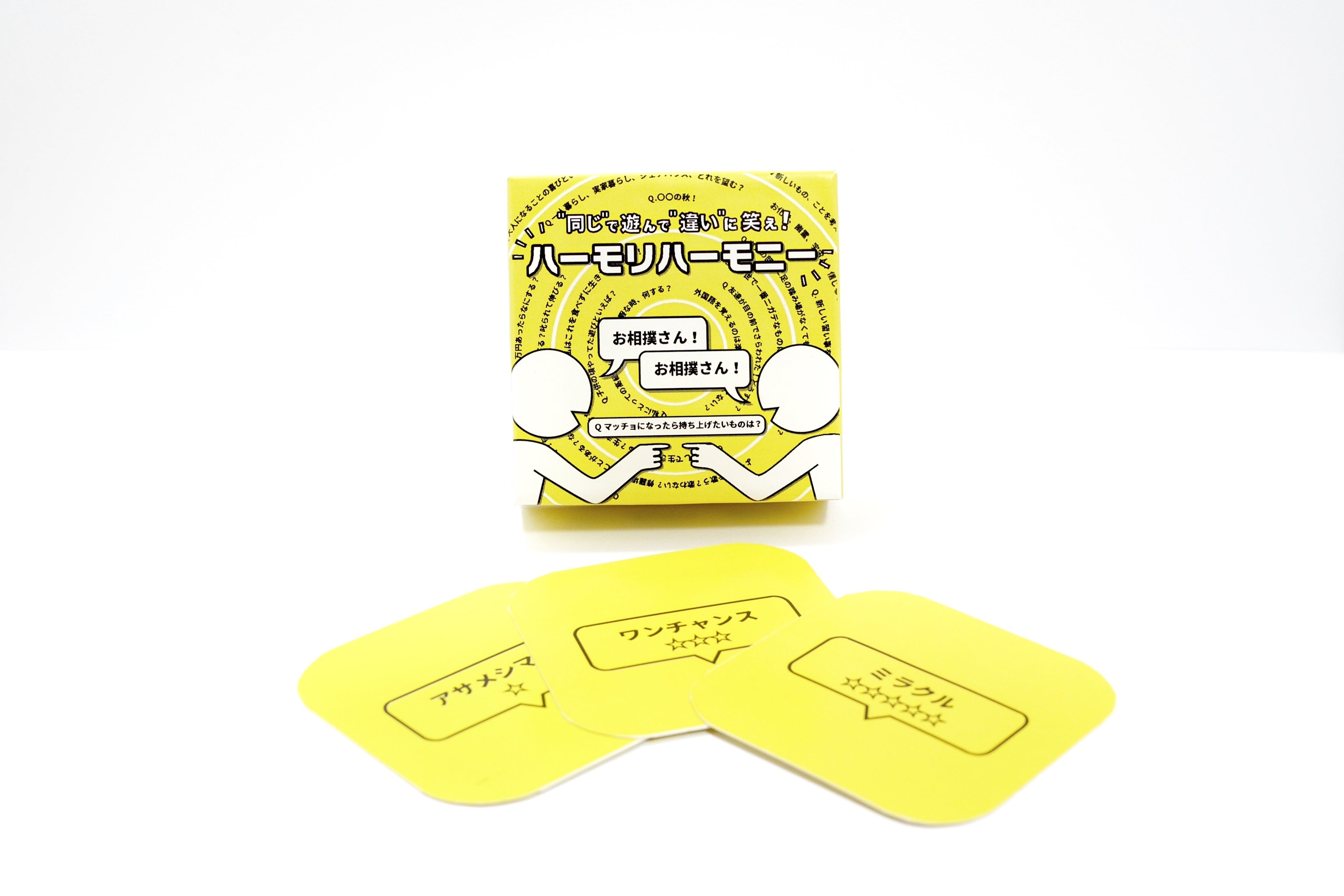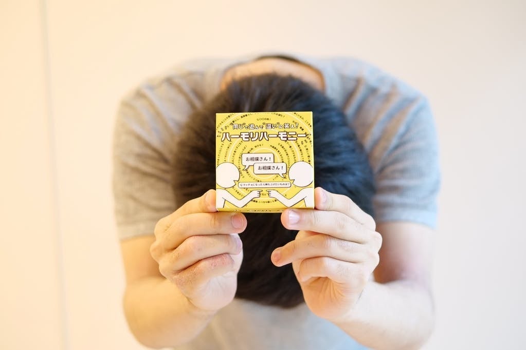 2019/08/24 16:49”同じ”で遊んで”違い”に笑え!ハーモリハーモニー の遊び方ハーモリハーモニーは全部で3通りの遊び方があります!今回、製作者の2人が実際に遊んでいる様子を撮影したので、合わせてご覧ください!なんと何回かハモってます!遊び方1:自分の答えで遊ぶ最初の遊び方はみなさんおなじみ「自分の答えで遊ぶ」です!カードに書かれた質問に対して自分の素直な答えを言います。・答えが一緒だった場合:ハモって相手と自分の共通点を知れる・答えが合わなかった場合:自分が知らなかった相手の一面を知ることができます遊び方2:世間一般の答えで遊ぶ続いては「世間一般の答えで遊ぶ」です!カードのお題で「世間一般にアンケートを取った時に一番多そうな答え」を予想して答えます!・答えが一緒だった場合:ハモって価値観が似ていることがわかります!・答えが合わなかった場合:日々感じていることの違いを知ることができます。遊び方3:どこかの誰かの答えで遊ぶ最後は「どこかの誰かの答えで遊ぶ」です!カードのお題に対して、どこかの誰か(渋谷のギャル、田舎の校長先生、大企業の部長)が答えそうなことを予想して言います。お題に答える前にどんな人の答えを予想するのか決めて遊びましょう!相手がどんな答えを言いそうか考えてあえて当てに行くのも面白いかもしれません!答えが一緒だった場合:ハモって価値観の違いがわかります!答えが合わなかった場合:日々感じていることの違いを知ることができます。いかがでしたか?ただ自分の答えでたまたまハモるのを待つのではなく、遊び方2や3のようにハモるのを狙って答えて遊ぶことができます!動画で見ていただけたようにハモった時の盛り上がりは本当に大きいです。ぜひ皆様の周りでご友人とご家族と遊んでみてください! もっと見る