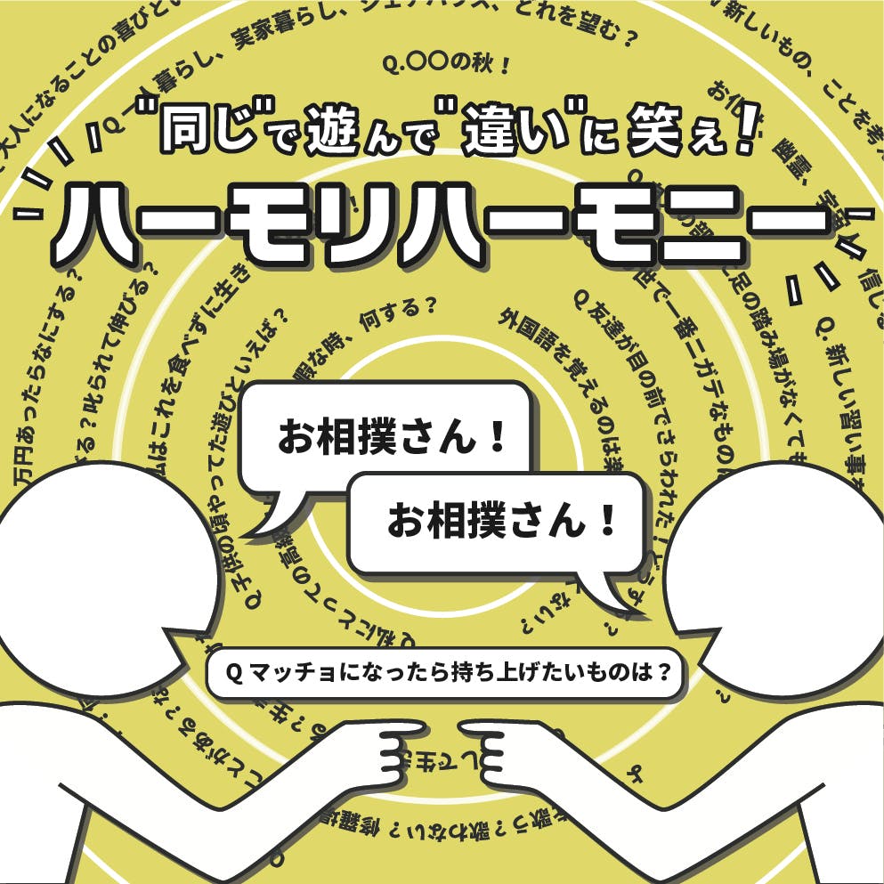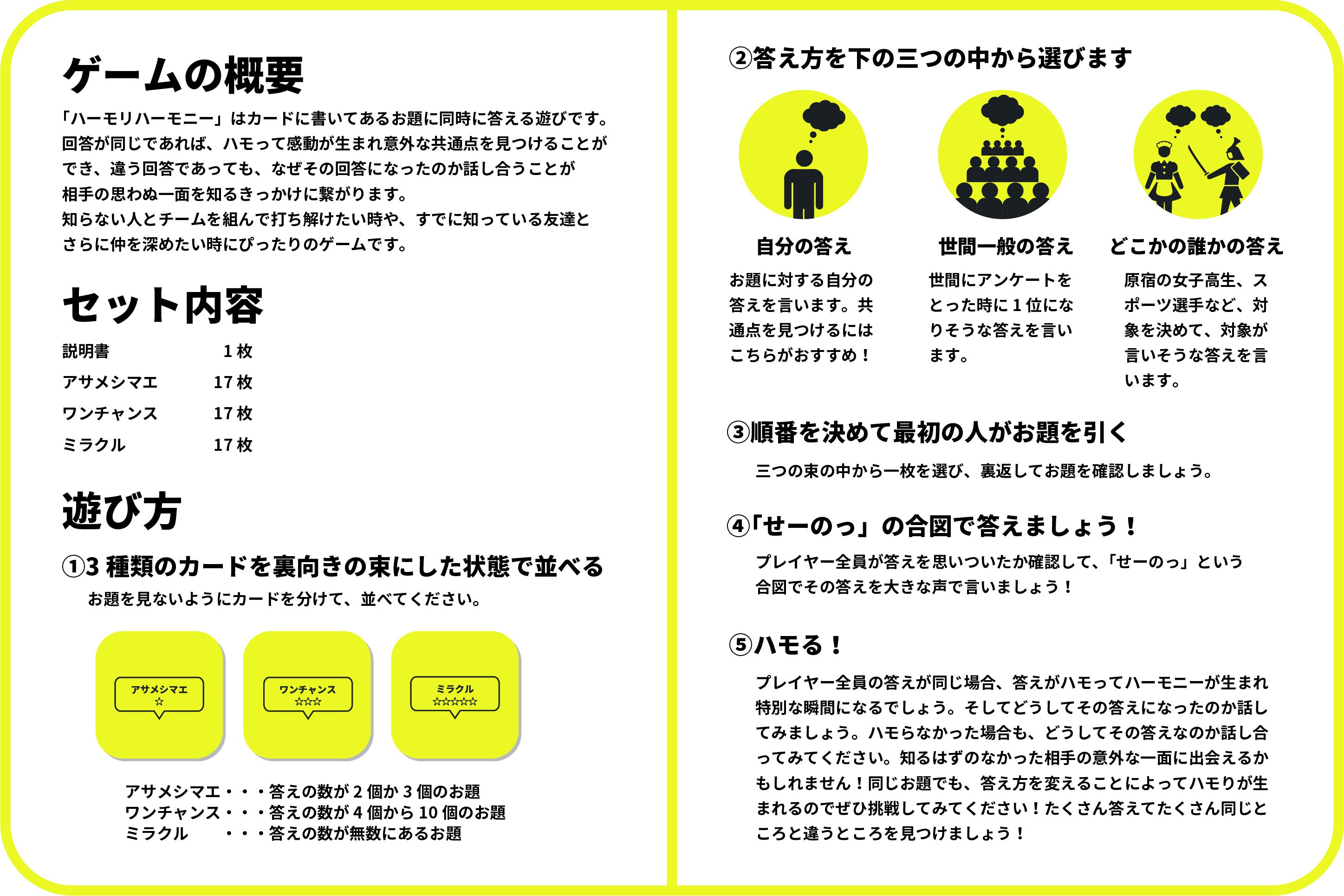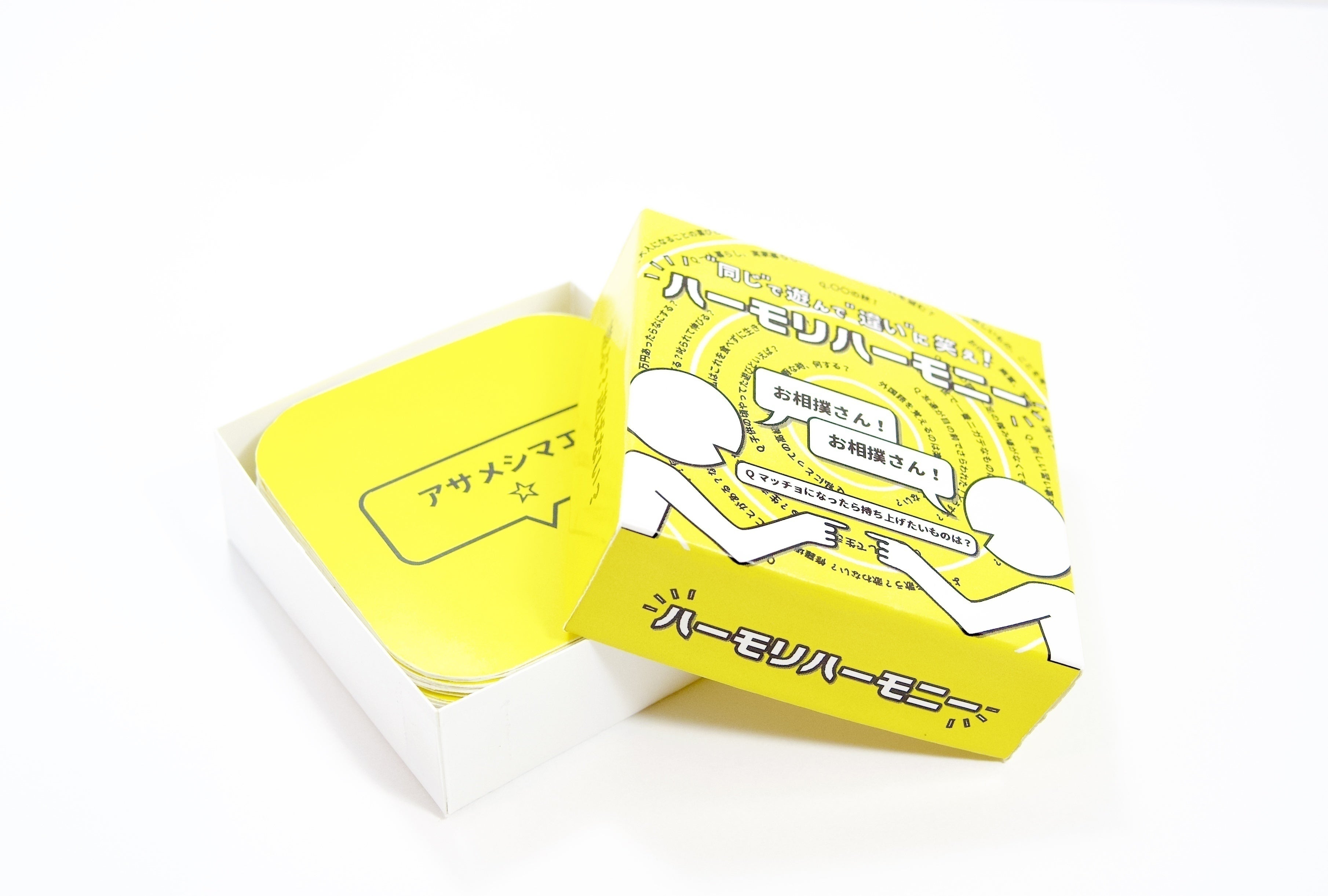 2019/08/24 16:49”同じ”で遊んで”違い”に笑え!ハーモリハーモニー の遊び方ハーモリハーモニーは全部で3通りの遊び方があります!今回、製作者の2人が実際に遊んでいる様子を撮影したので、合わせてご覧ください!なんと何回かハモってます!遊び方1:自分の答えで遊ぶ最初の遊び方はみなさんおなじみ「自分の答えで遊ぶ」です!カードに書かれた質問に対して自分の素直な答えを言います。・答えが一緒だった場合:ハモって相手と自分の共通点を知れる・答えが合わなかった場合:自分が知らなかった相手の一面を知ることができます遊び方2:世間一般の答えで遊ぶ続いては「世間一般の答えで遊ぶ」です!カードのお題で「世間一般にアンケートを取った時に一番多そうな答え」を予想して答えます!・答えが一緒だった場合:ハモって価値観が似ていることがわかります!・答えが合わなかった場合:日々感じていることの違いを知ることができます。遊び方3:どこかの誰かの答えで遊ぶ最後は「どこかの誰かの答えで遊ぶ」です!カードのお題に対して、どこかの誰か(渋谷のギャル、田舎の校長先生、大企業の部長)が答えそうなことを予想して言います。お題に答える前にどんな人の答えを予想するのか決めて遊びましょう!相手がどんな答えを言いそうか考えてあえて当てに行くのも面白いかもしれません!答えが一緒だった場合:ハモって価値観の違いがわかります!答えが合わなかった場合:日々感じていることの違いを知ることができます。いかがでしたか?ただ自分の答えでたまたまハモるのを待つのではなく、遊び方2や3のようにハモるのを狙って答えて遊ぶことができます!動画で見ていただけたようにハモった時の盛り上がりは本当に大きいです。ぜひ皆様の周りでご友人とご家族と遊んでみてください! もっと見る