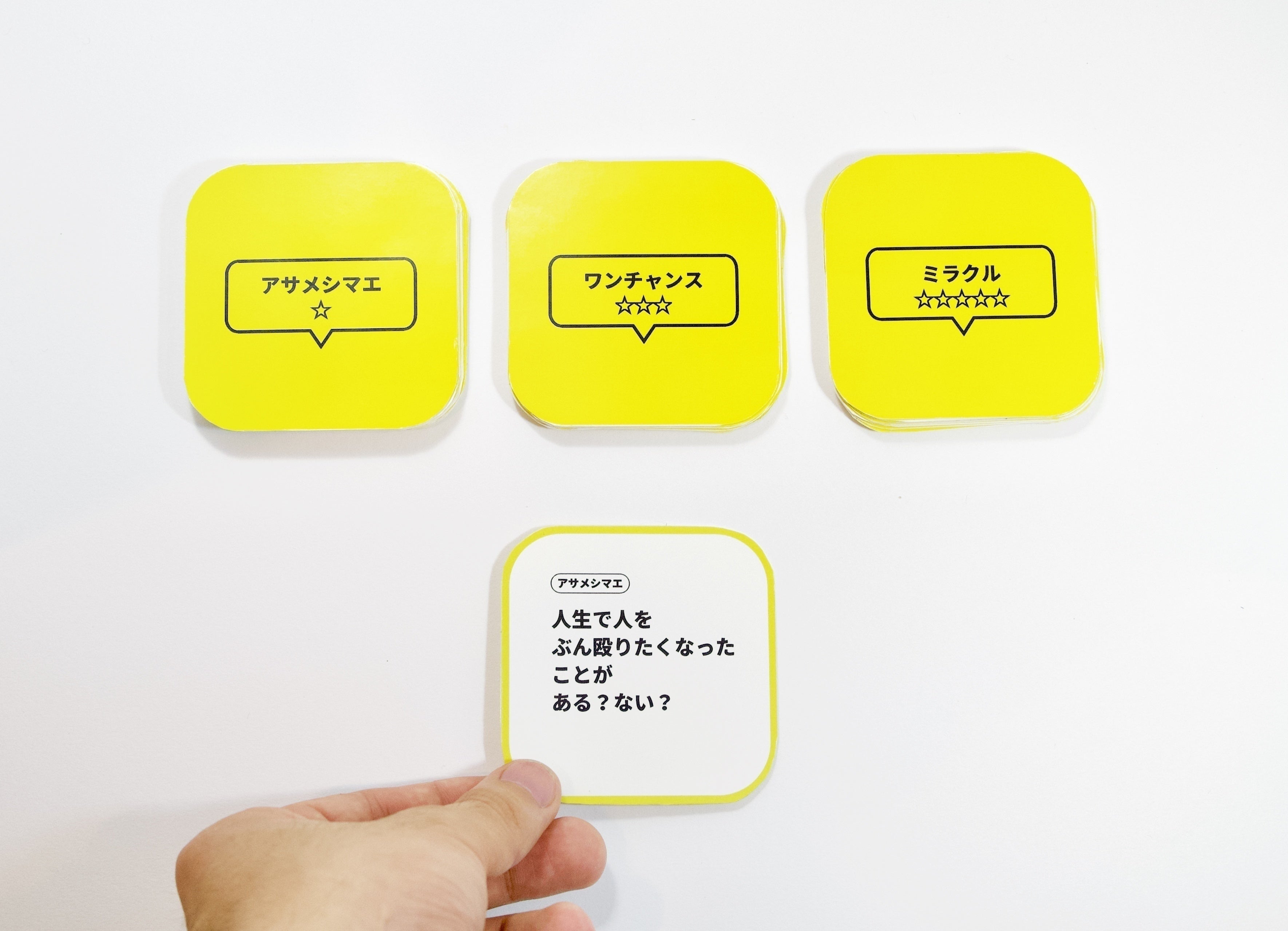 カードに書かれたお題にせーので答えるだけの、非常にシンプルなゲームです。