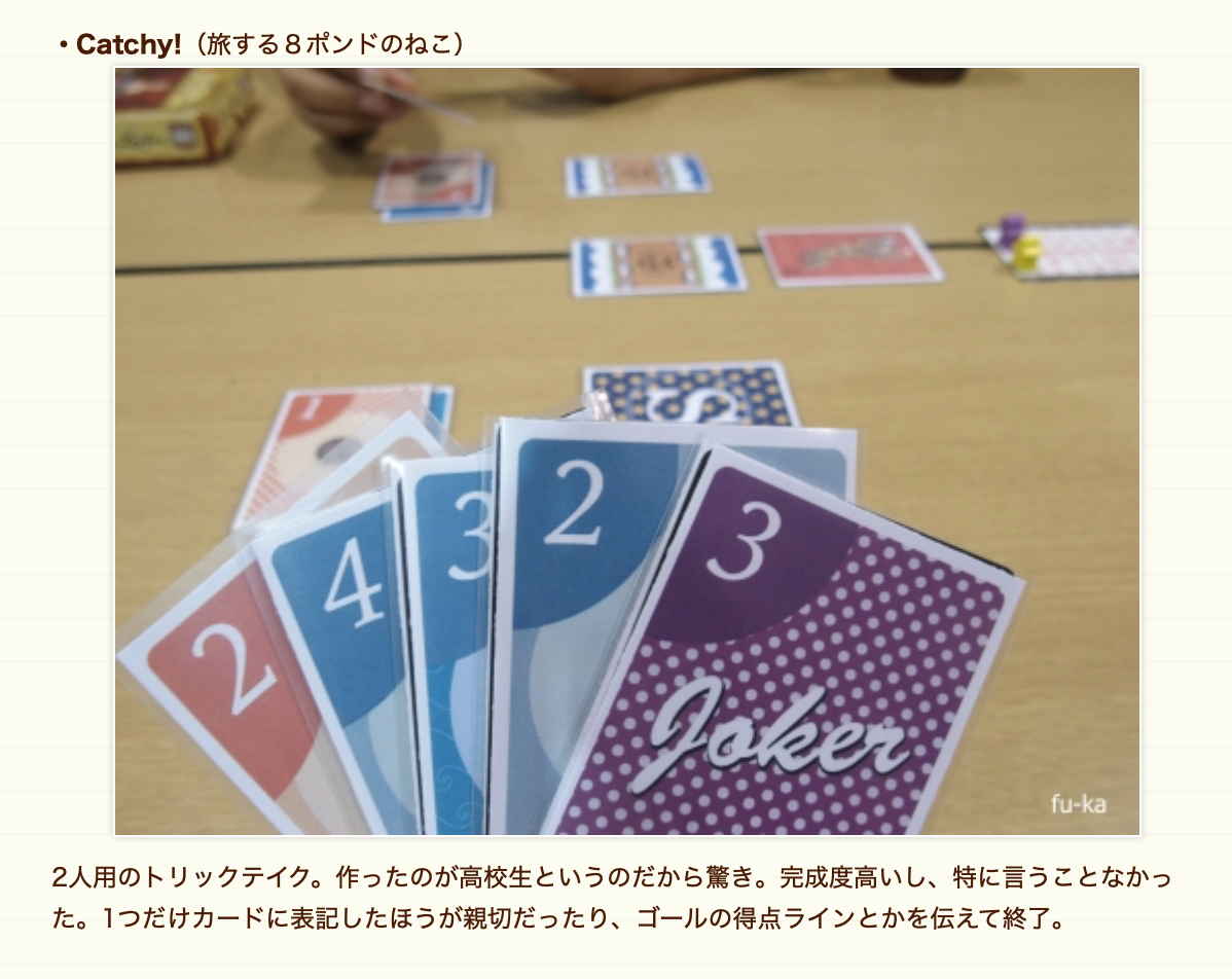 「Catchy!」は「難しそう」「よくわからない」というトリックテイキング観を払拭し、普及のための糸口を増やすことにも貢献するはずです。僕も「Catchy!」をプレイした後日、友人に99を勧めた際、「あの、カード出してくやつね」とルールの伝わりが非常に早く、感動したことを覚えています。「Catchy!」のもともとのスタート地点は、トリックテイキング普及の想いでもありました。