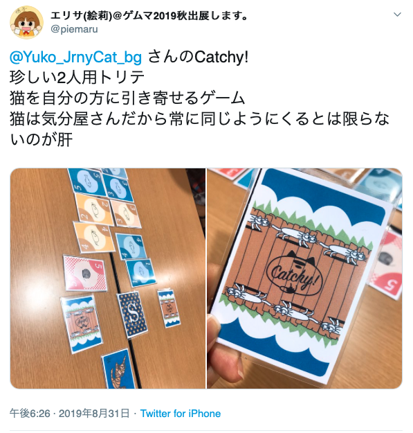 この「 Catchy!」は今回、ボードゲームの即売会である「ゲームマーケット2019秋」での出展、販売を目指しています。