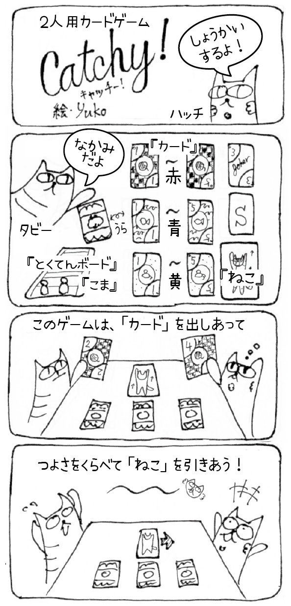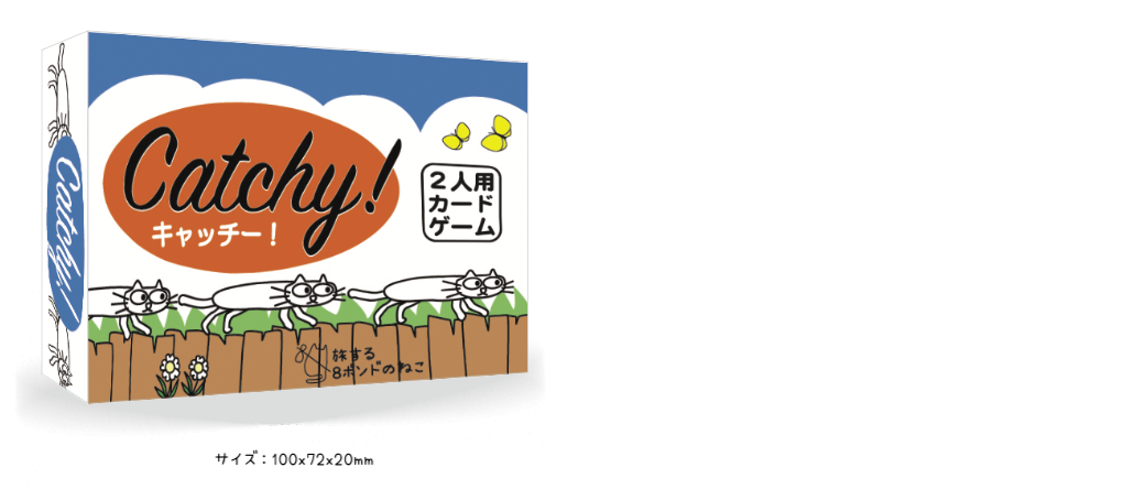 プレイヤーがカードを出すたびに、気まぐれ「ねこ」のご機嫌はコロコロ変わります。そんな「ねこ」のご機嫌をとりつつ、より自分の側へと引き寄せていくのも、「 Catchy!」の醍醐味です。何度も遊ぶうちに、「ねこ」の動きがつかめてきて、より上手く「ねこ」を引き寄せられるようになるはず!?