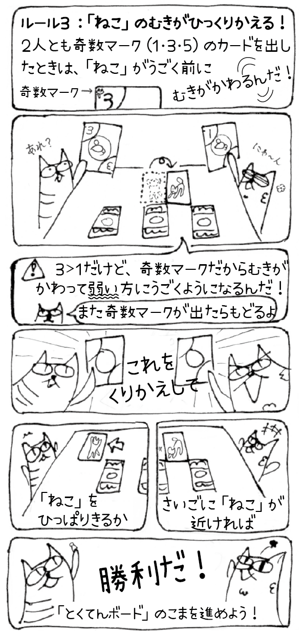 プレイヤーは1枚ずつ数字の書かれたカードを出し合ってその強さを競い、「ねこ」を引き寄せ合います。ただし「ねこ」はとても気まぐれで、「プレイヤーが2人とも奇数を出した時」、いきなりご機嫌が変わります。そして、今まで強い方に寄っていた「ねこ」が弱い方に寄ったり、逆に弱い方から強い方に寄ったりしてしまうのです。ままならないご機嫌をコントロールしながら、「ねこ」を自分の方に引き寄せよう!