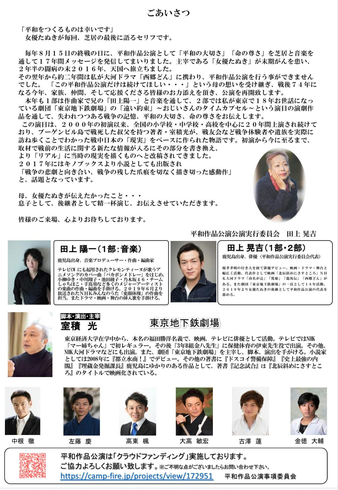 平和作品公演実行委員会、田上晃吉(たのうえ こうきち)です。