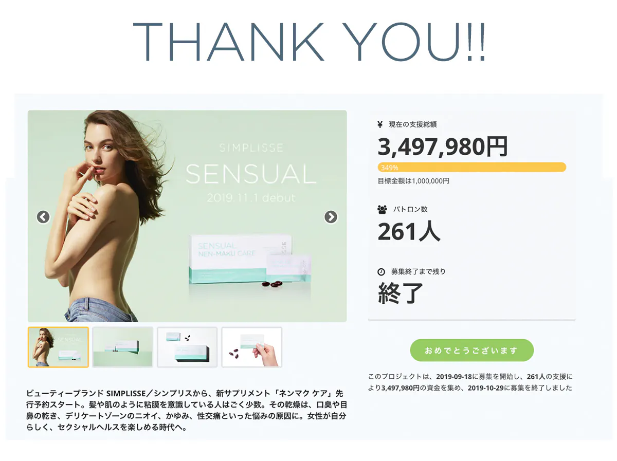 2019/10/30 19:40皆さまの多大なるご支援により、SIMPLISSE/シンプリスのプロジェクト『潤って、ニオわない。女性のための新サプリメント「ネンマク ケア」』先行予約が目標を大幅に達成し、終了いたしました!女性と性について真摯に考えたいという想いのもと、セクシャルヘルスへのチャンレンジの一環として行なった「ネンマク ケア」の先行予約ですが、261名の方のご支援とたくさんの反響をいただきました。心より御礼申し上げます。この度のプロジェクトは、ビューティー・ヘルスケアのカテゴリにて、キャンプファイヤー史上4番目に多い支援者数となりました。多くの方に関心を寄せていただけましたこと本当に嬉しく思います。また、金額では当初の目標100万円を早々に達成し、終了直前に設定したストレッチゴール300万円をも大幅に上回る3,497,980円ものご支援をいただきました。いただいたご支援は、多くの女性が悩むセクシャルヘルスのサポートや、まだ認知が低いけれどとても大切な粘膜のケアの啓蒙活動のため、大切に使わせていただきます。●商品は、11月7日(木)より順次発送いたします。到着まで今しばらくお待ちくださいますようお願い申し上げます。また、弊社シンプリス 公式サイトでお使いいただけるご優待クーポンも同梱いたしますので、どうぞご活用ください。キャンプファイヤーでのプロジェクトは終了しましたが、私たちのセクシャルヘルスへの挑戦は始まったばかりです。シンプリス 公式サイトでは、セクシャルヘルスや「ネンマク ケア」についての正しい知識をお届けするべく様々な情報を発信していく予定です。今後のシンプリスの動向にご注目いただけますと幸いです。商品がお手元に届きましたら感想など、ぜひお聞かせください。「ネンマク ケア」の輪がより大きく広がり、女性が心地よく生きるためのサポートができますよう、これからもシンプリスは邁進してまいります。どうぞよろしくお願いいたします。2019年11月1日発売シンプリス センシュアル ネンマク ケア<サプリメント> 44.6g(30袋/30日分) 8,700円+税>>公式サイトにて「センシュアル」特設ページ公開中!商品詳細もこちらから もっと見る