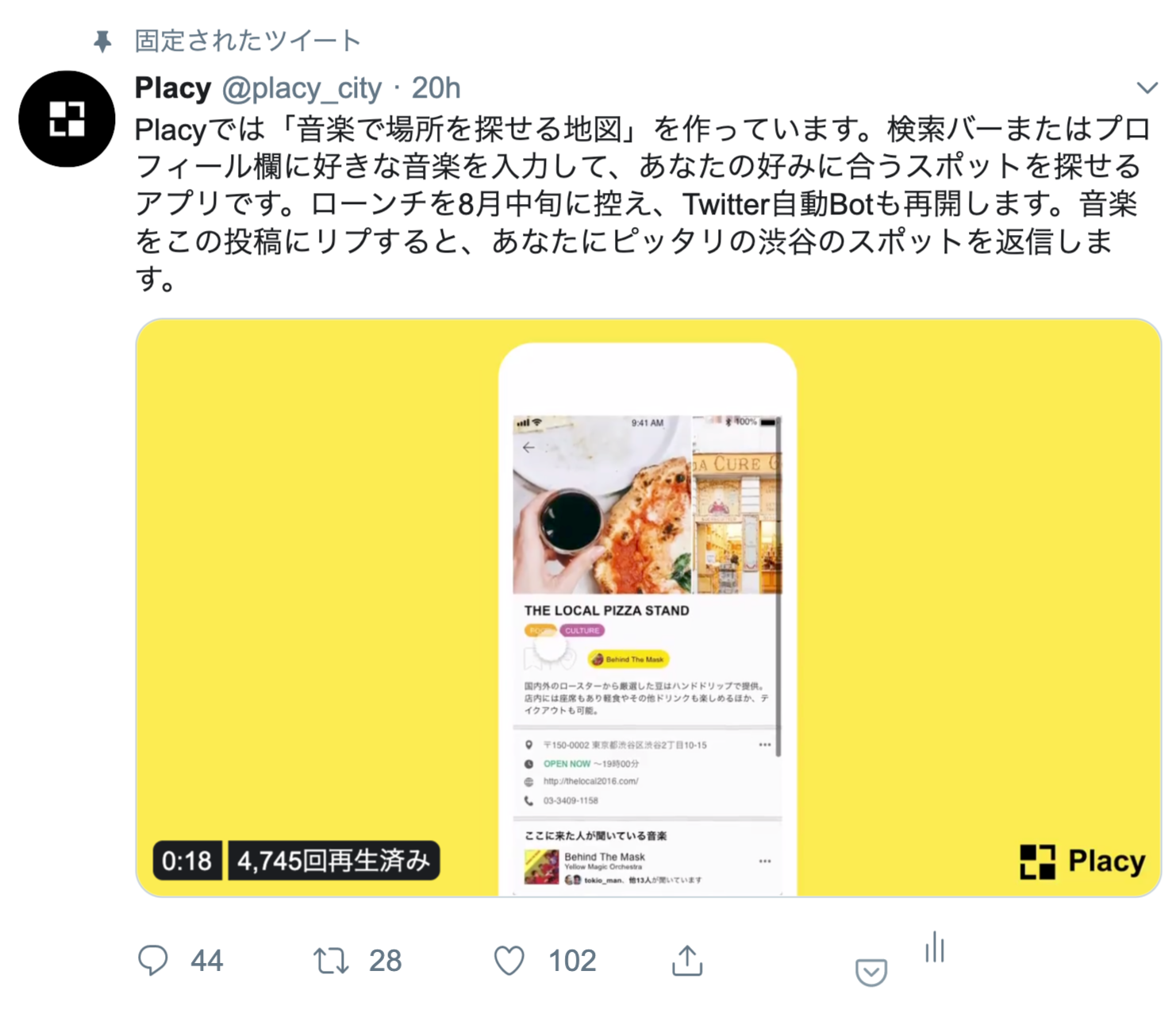 好きな音楽をPlacyのツイッターアカウントに投げるだけで、その音楽の雰囲気にあう渋谷の喫茶店が返信されます。