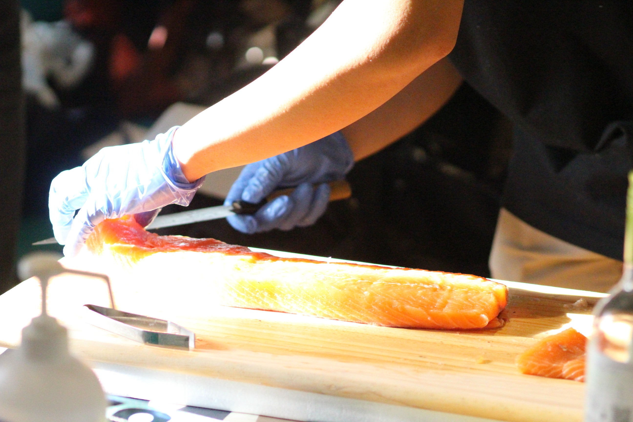 「予算を鑑みマグロ解体ショーは依頼できなくなった。毎年解体ショーを楽しみにしている方も多く、なんとかサーモンでお願いできないか」といったご連絡を今年に入って頂くようになりました。しかし、地理的にも距離があり、衛生面での責任を負えないためお断りさせて頂いたのですが、低予算でも衛生管理の体制さえ整えば解体ショーは可能あり、またサーモンには間違いなく人を沸かすポテンシャルを秘めています。老若男女に人気があり、文化的にもストーリーにも富んだサーモンだからこそ、まだ知られていない面白い秘密が数多くあるサーモンだからこそ、多世代を巻き込んだ新たな賑わいを創出できると確信しております。