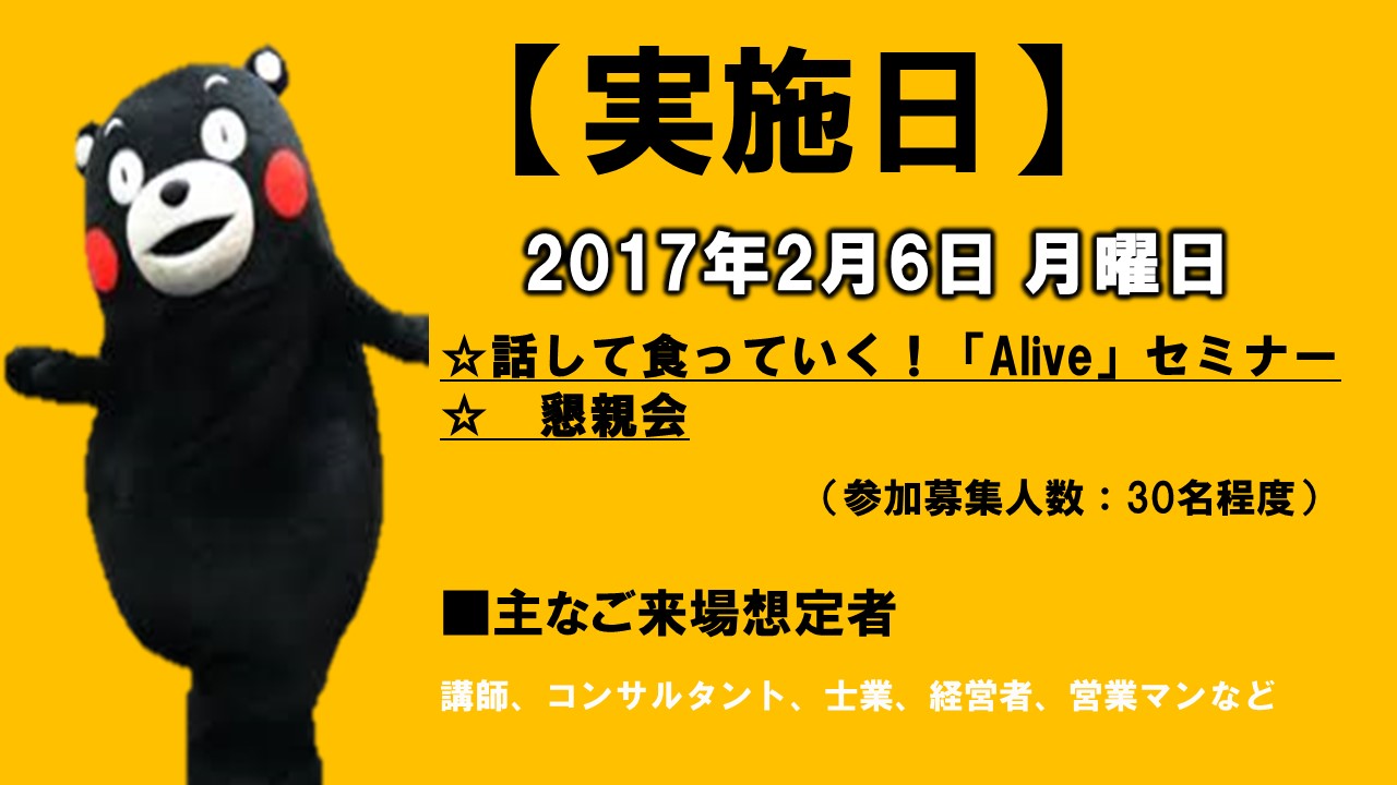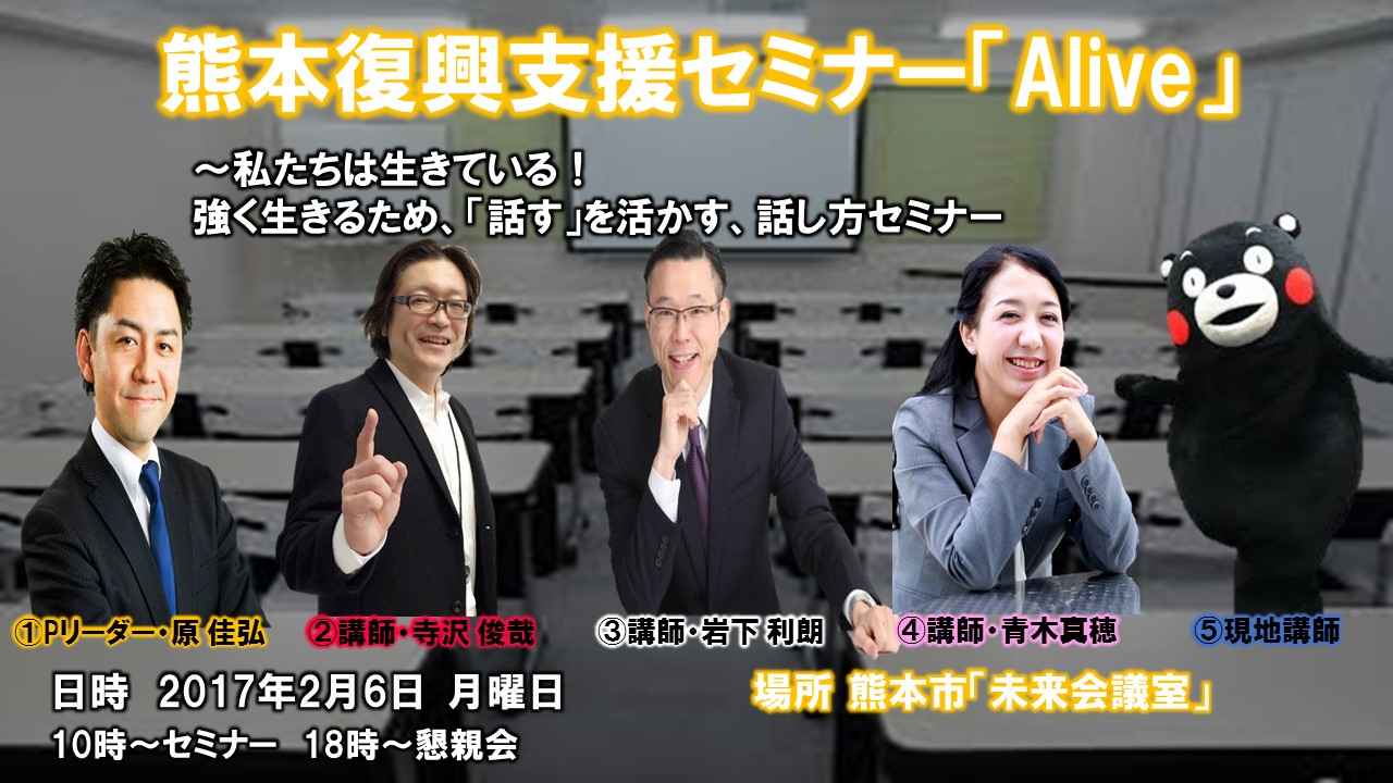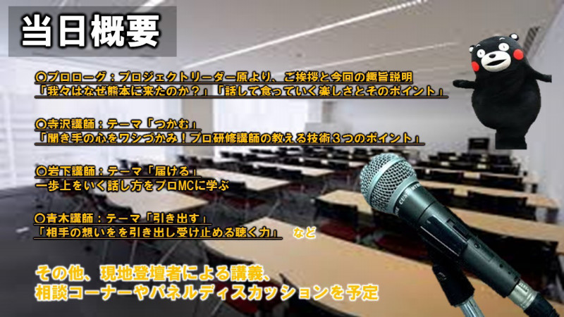 このセミナーでは、「話す」を必要とする、士業、コンサルタント、経営者、営業マン、店舗の販売員などに参加して頂ければ、と思っております。プロジェクトメンバーの中で「話す」事を生業としている講師がノウハウをお伝えし、参加の皆様がスキルアップすること、そしてそんな繋がりを作れれば、より一層熊本と九州が活気あふれるようになればと考えております。