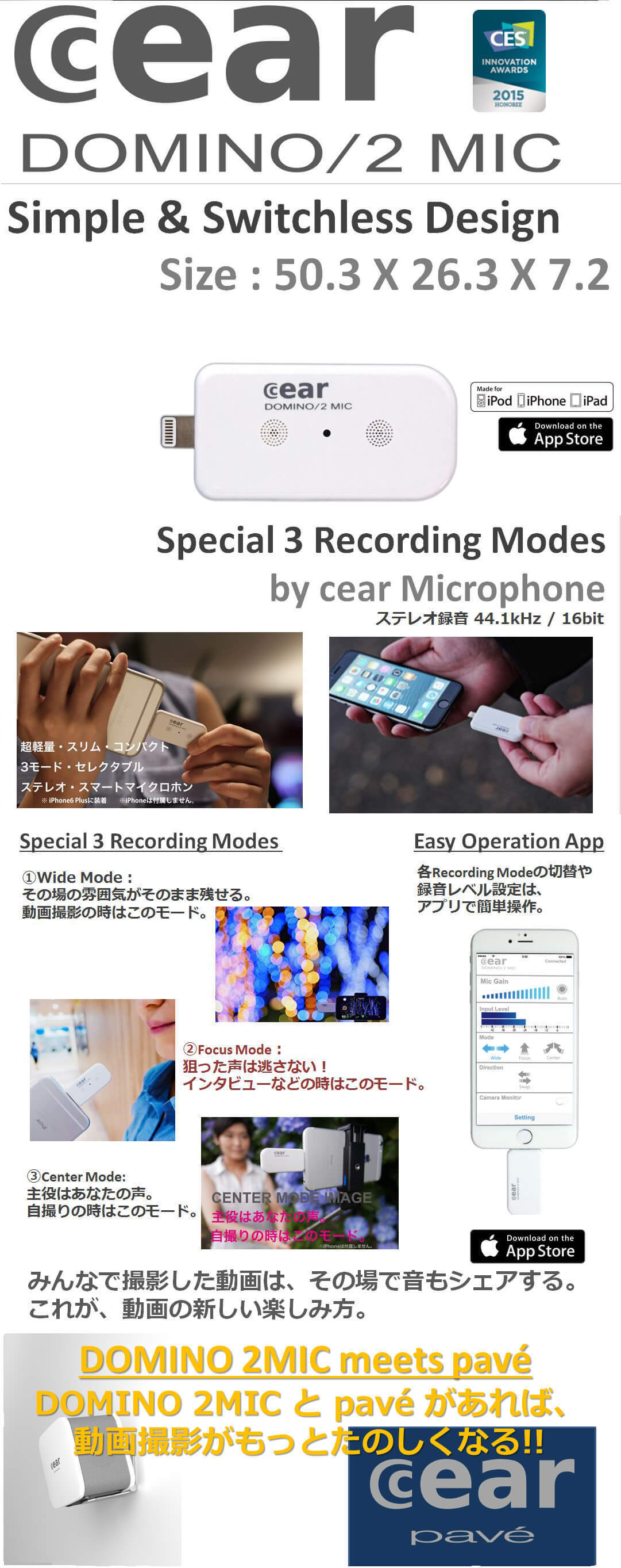 cearプロダクト第1弾の「DOMINO 2MIC」を使って撮影した動画の音声を再生するスピーカーシステムとしてpavéを使えば、まるで動画撮影したその場にいるような音場を再現することができます。