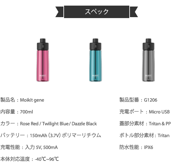 Moikit gene は、一般的な水筒やスポーツボトル同様の機能はもちろん、テクノロジーによってより良い水分補給習慣をもたらす新しい形のスマートボトルです。あなたの水分摂取量を自動的に記録するだけでなく、スマートフォンのMoikitアプリと連動することで、より多くの水分管理機能を活用でき、皆さんの水分補給習慣の改善を助けてくれます。