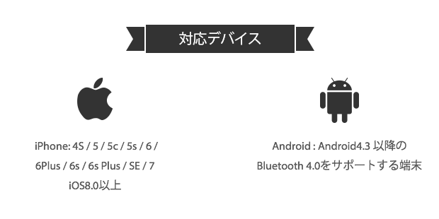 → Apple Store またはGoogle Play にて無料でダウンロード可能です。 AppleiOS8.0 以降のiPhone4S / 5 / 5c / 5s / 6 / 6Plus / 6s / 6s Plus / SE / 7、及びBluetooth 4.0 をサポートするAndroid 4.3 以降のスマートフォンに一般的に対応します。