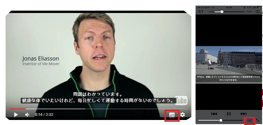 動画には日本語字幕が設定してありますが、お使いの端末の設定によっては字幕がでない場合があります。その場合は下記画像の赤枠のボタンを押していただくと字幕が表示されますのでご利用ください。