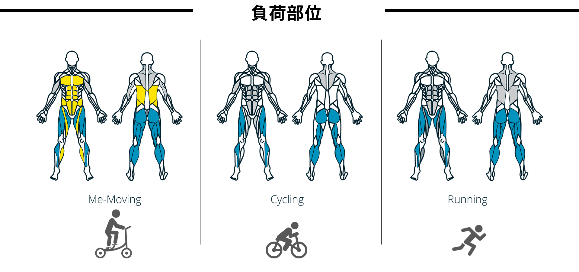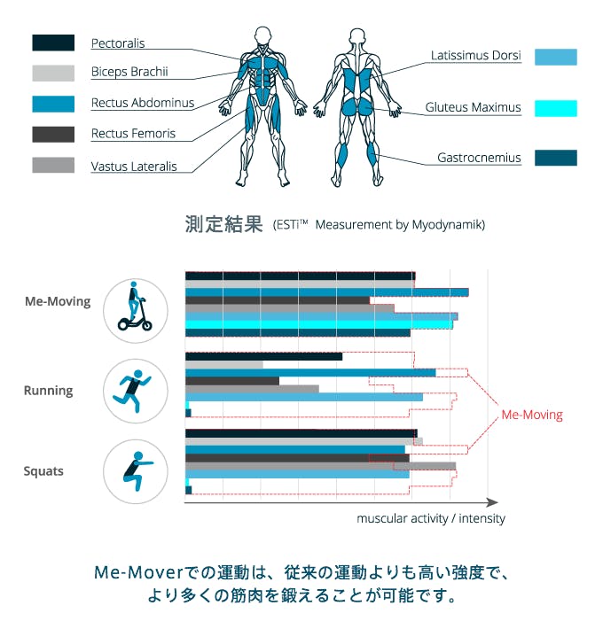 また、Me-moverはその独特なライディングスタイルによって、ランニングやサイクリングよりも鍛えられる部分が多くなっています。