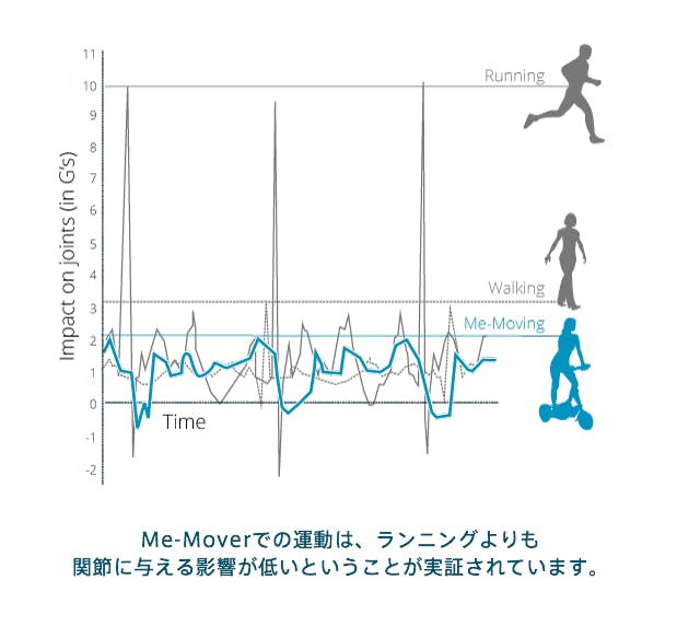 Me-Moverは関節(膝、足首、脊椎)にも非常に負担の少ない運動器具という調査結果がでてきます。ランニングやサイクリングと比較した場合、Me-Moverを最大強度ので使用したとしても、走ったり歩いたりするよりも衝撃が大幅に低いことが確認されています。また同時に、人間工学的に正しい直立した姿勢は、サイクリングよりも背中と首に負担が少ないとされています。
