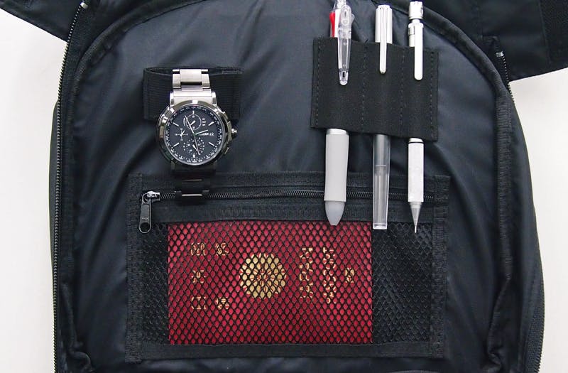 手帳やアメニティポーチなどを入れることができます。上と下にジップがついているので、デイパックモードでも壁掛けモードでも中身が取り出し自由です。
