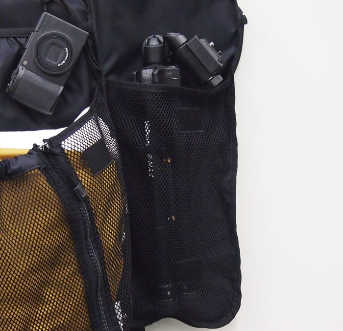 一眼レフカメラやダウンジャケットなど、形が歪なものを簡単にホールド・収納できます。ウェットスーツに使用する「ネオプレーン」という生地を使用しており、伸縮性があり、水もはじきます。